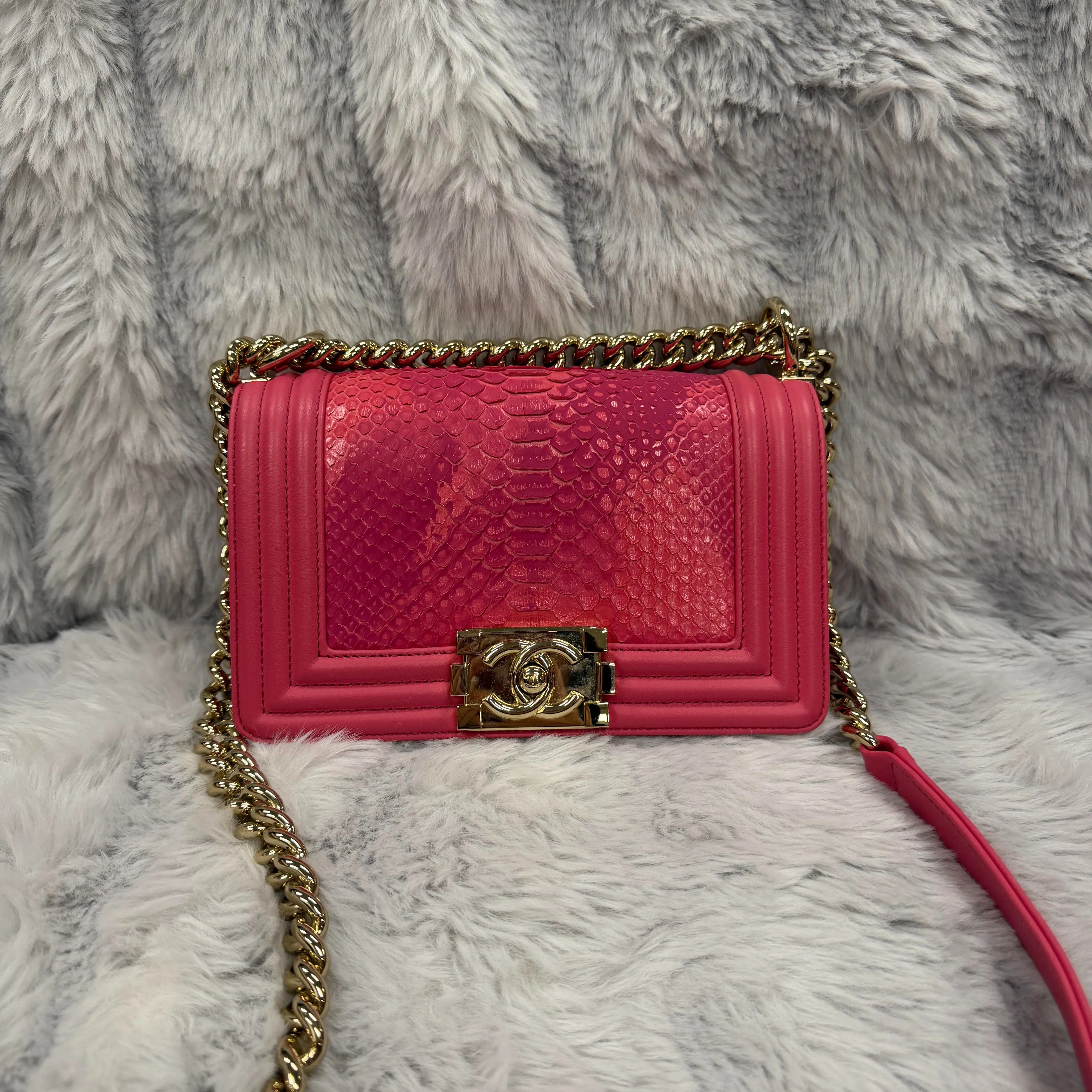 Pre-owned CHANEL Python Shoulder Bags Rose Red Small Boy Flap Bags XiaoTang0210