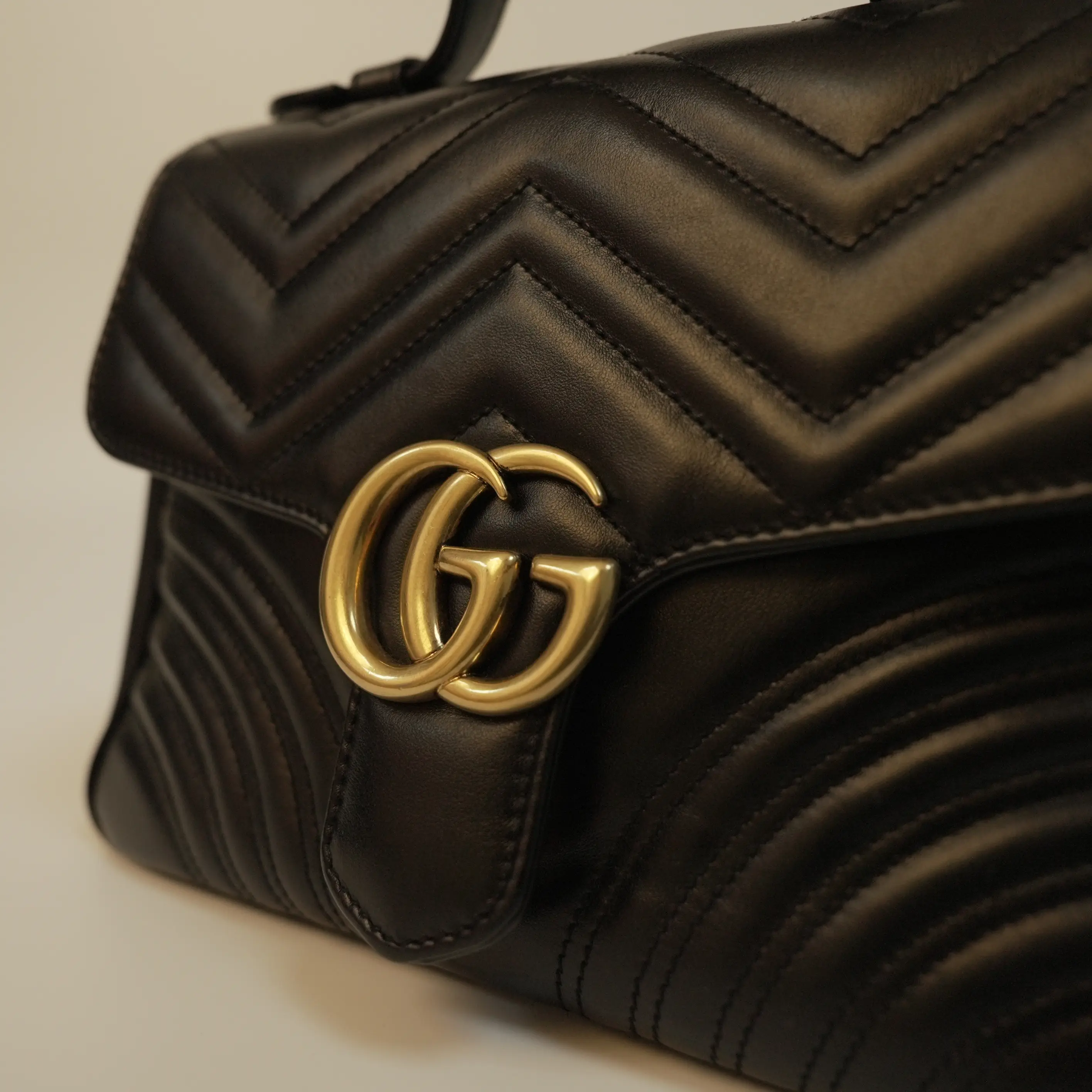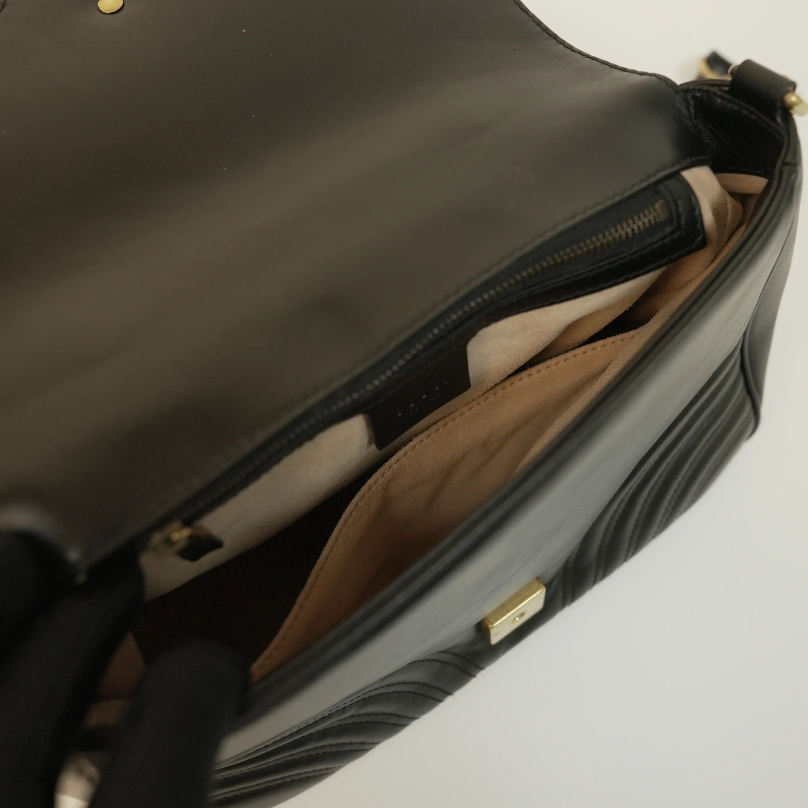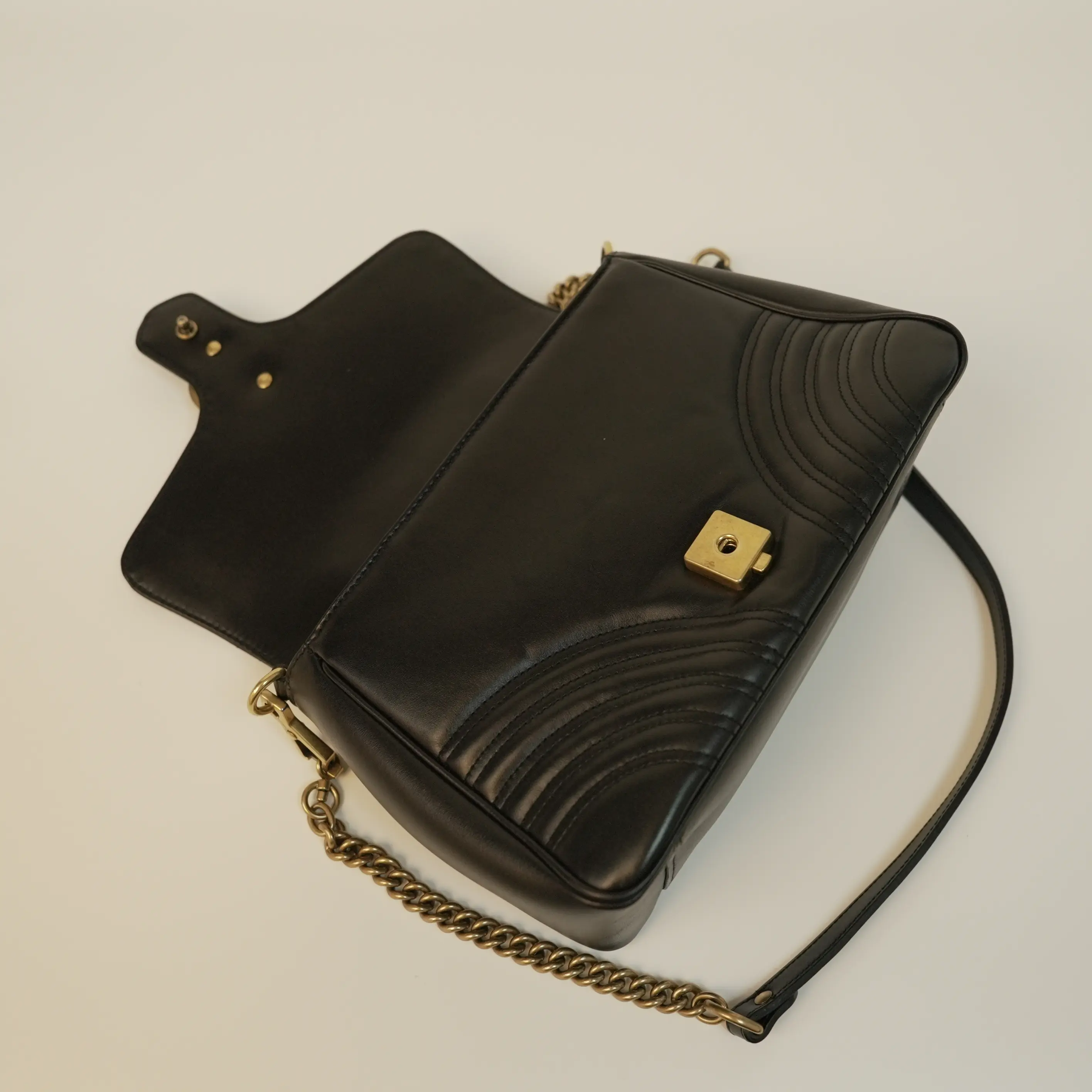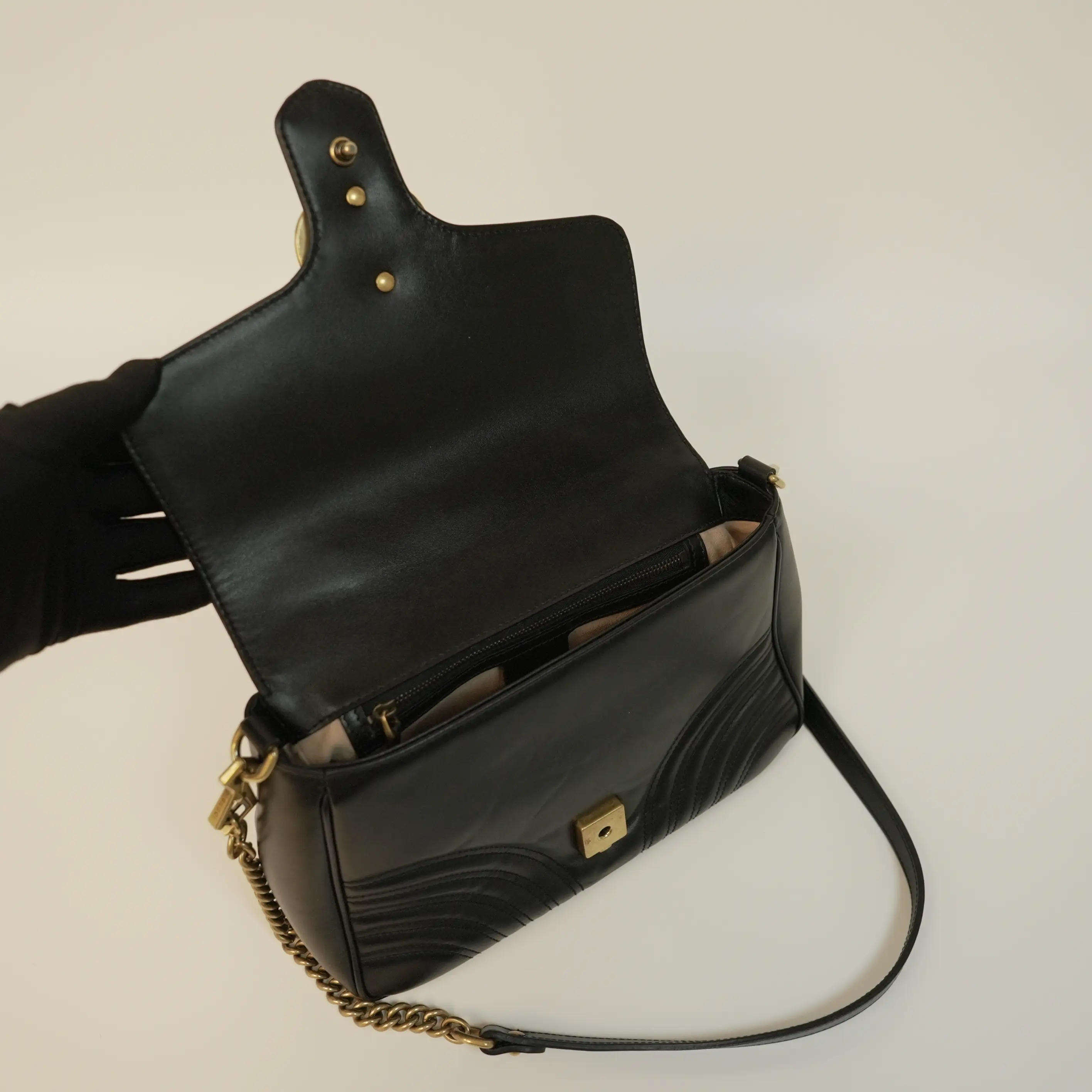 In a practical medium size, this Marmont messenger bag strikes the perfect balance between compactness and storage space. Its well-designed interior offers ample room for your daily essentials, such as your phone, wallet, keys, lipstick, and a small notebook, while the structured silhouette keeps your belongings organized. The flap closure with the iconic gold clasp ensures your items are secure, adding both style and functionality.