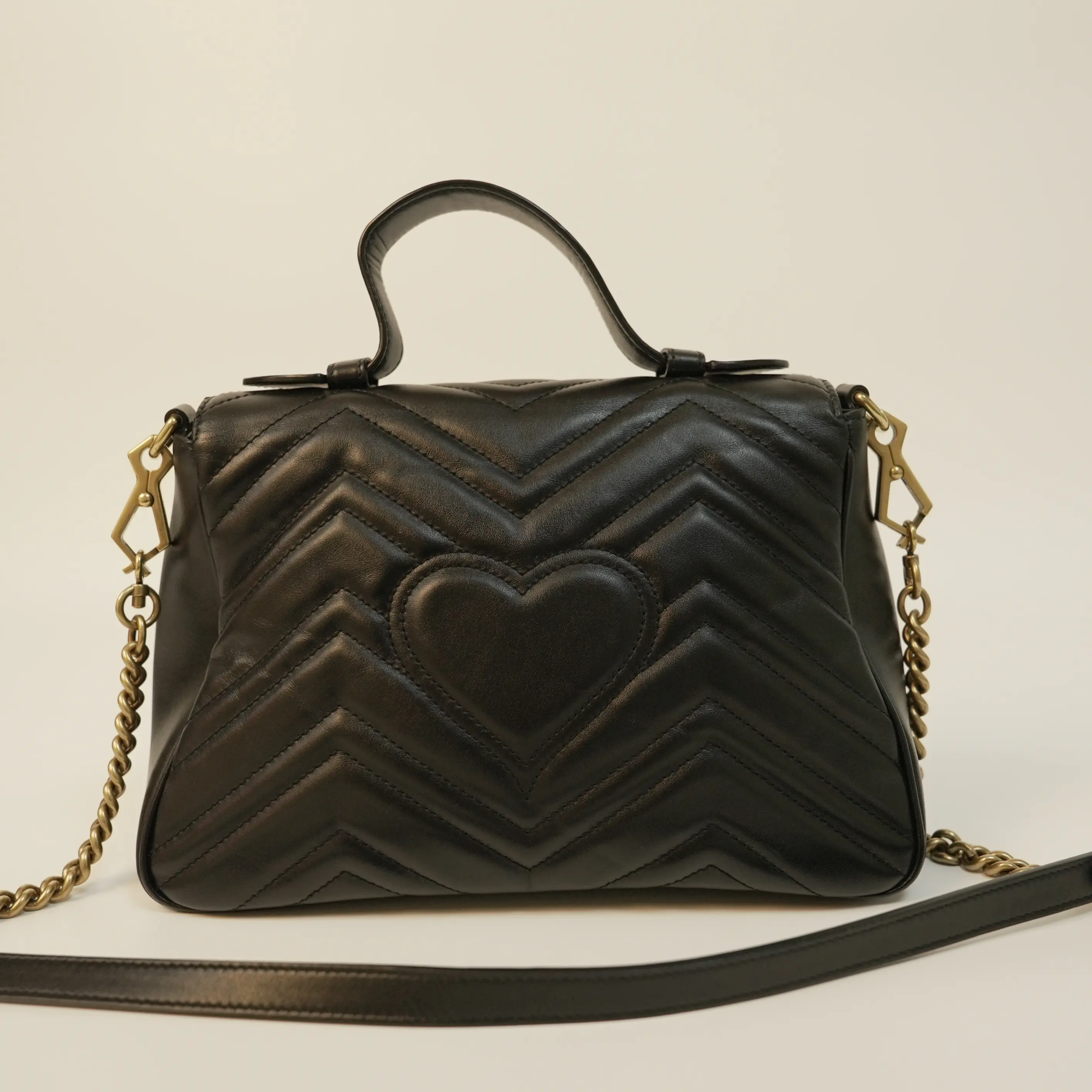 Featuring Gucci’s iconic gold hardware, including the brand’s signature interlocking G clasp and chain strap, the bag adds a touch of opulence and sophistication. The gold accents contrast beautifully with the black leather, elevating the overall design and highlighting the brand’s attention to detail. Designed as a chain messenger bag, it comes with an adjustable chain strap that allows for multiple carrying styles — wear it crossbody for hands-free convenience or on the shoulder for a polished, elegant look.