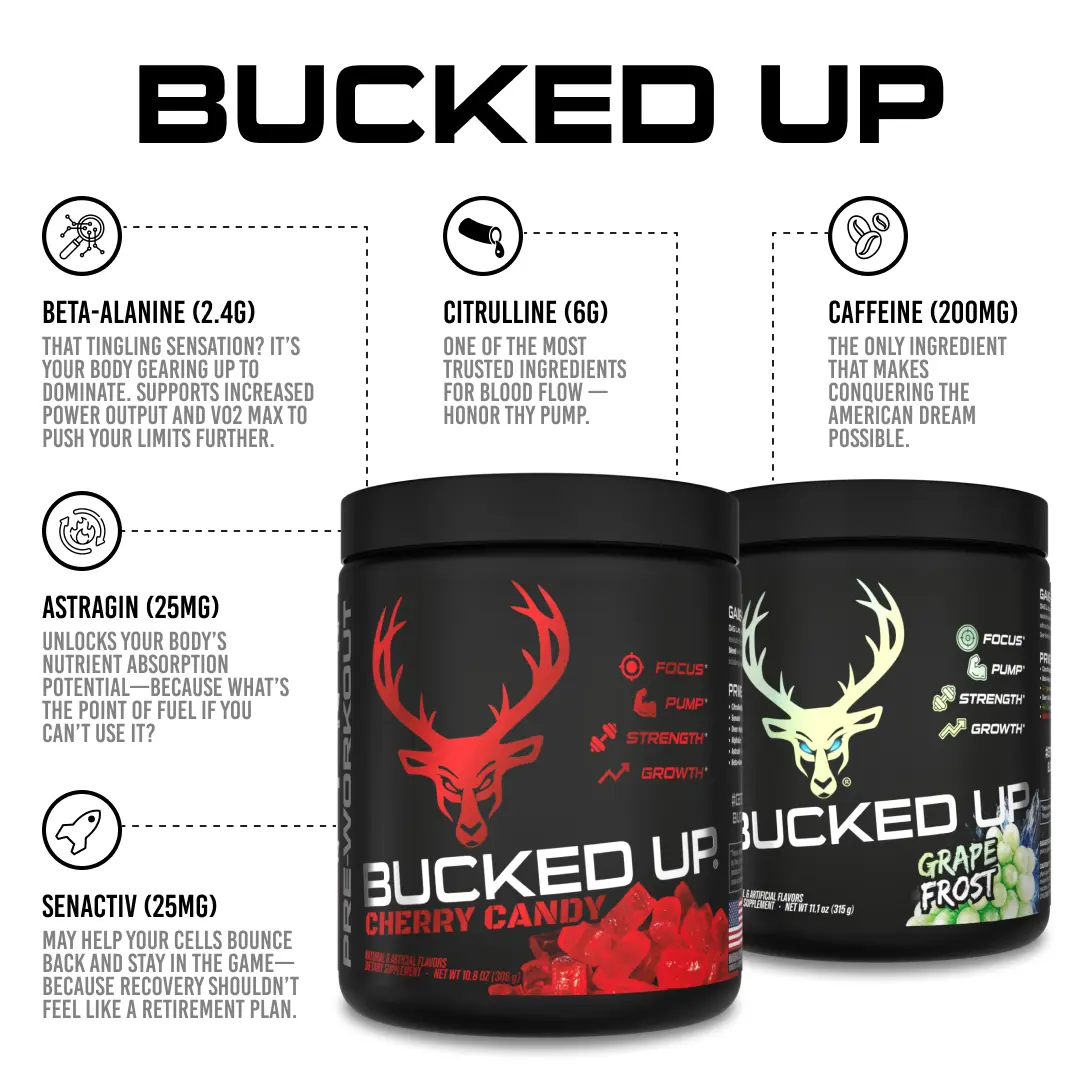 Bucked Up is a pre-workout designed to take your workouts to the next level. It offers energy, endurance, focus, and pump. Developed for serious athletes, bodybuilders, and anyone seeking pump, focus, energy, and growth. Each serving contains approximately 200mg of caffeine.