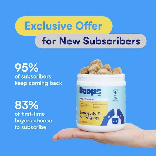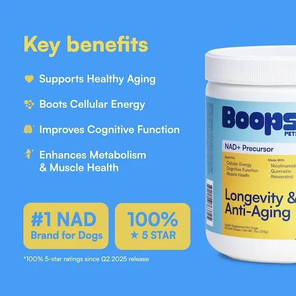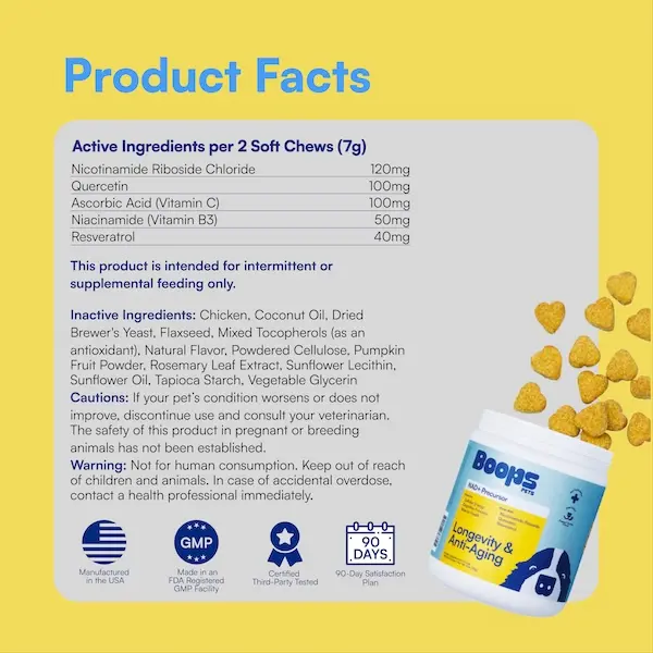 To be clear, this supplement does not actually contain any NAD (Nicotinamide adenine dinucleotide), but rather the supplement contains some of the critical components to help your dog's body to produce NAD. And yes, to be clear, NAD is a critical player in your dog's health. NAD actually exists in all living cells and plays key roles in metabolism and energy production, and in the inflammatory response. Because nearly all disease begins as an over reactive inflammatory response, it is critical that cellular 'communication' is clear and not confused; and NAD helps cells to do just that. But NAD quality and production declines with age, which may be a big reason why we all, dogs included, become less energetic and more prone to illness and disease with age. Preliminary research has shown that improving NAD production can boost energy levels and moderate inflammatory responses, among other important tasks like DNA repair. NAD is actually a coenzyme, meaning that it is needed for various enzymes to activate and perform their tasks. Functioning as a central component within biological systems, NAD facilitates numerous essential biochemical reactions. For these reasons, NAD is widely regarded as a critical element in the slowing or reversing of the aging process. This BOOPS Senior Dog Supplement includes ingredients such as Nicotinamide Riboside Chloride (nicotinamide riboside) which is changed inside the body into NAD, and niacinamide, which is another component of NAD and can increase the levels of NAD being produced. Other ingredients in the supplement include quercetin and resveratrol which are both regarded as compounds useful for improving health. Resveratrol is an antioxidant that activates genes that ward off disease and aging, while quercetin is another antioxidant that reduces inflammation, among other benefits. So it seemed only reasonable to order these supplement chews for our 10 year old dog, Ben. He seems to think of them as treats, and we rest a little easier knowing that he is getting some 'cutting edge' supplements that are based on recent and ongoing research that will hopefully make his coming years a bit more happy and healthy. Or maybe a LOT more happy and healthy!