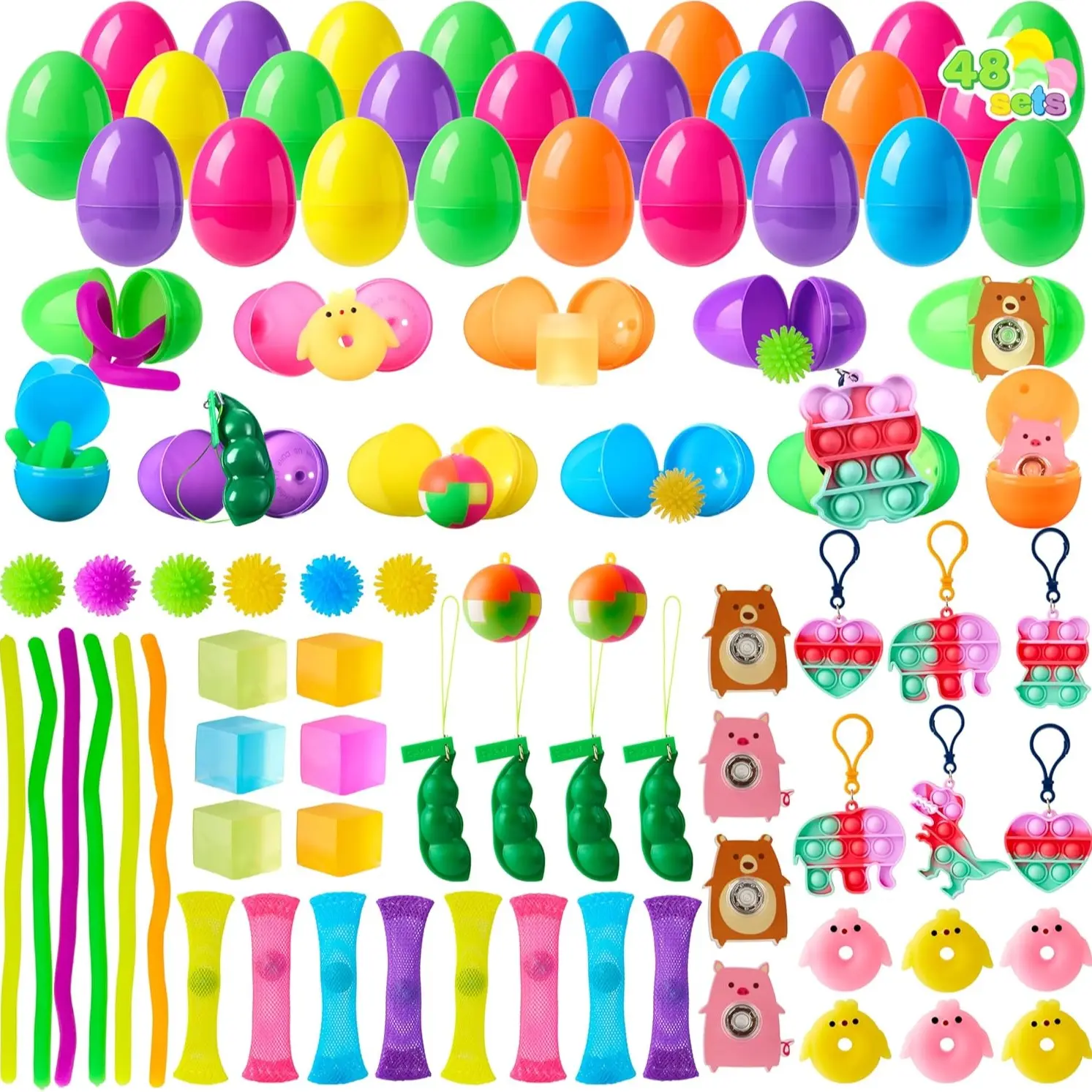 ¡Each egg is prefilled one toy and one easter sticker; 36pcs/48pcs/60pcs/80pcs/100pcs/120pcs/144pcs/160pcs/200pcs Pieces Toy Prefilled Premium Easter Eggs include multiple Unique Types of toys including Mochi squishy toy, Erasers, Little Ducky Erasers, Bunny Erasers, Easter Bracelets, Pull Back cars, Easter Rubber Rings, Rabbit Dolls, Unicorn Keychain, and Dinosaur, etc.