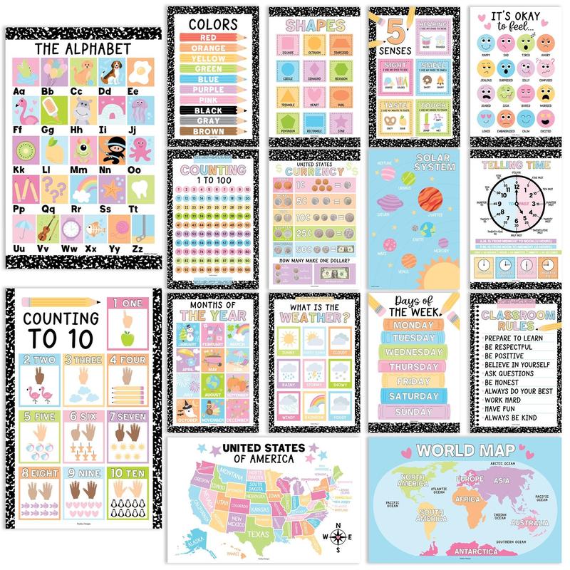 This set includes 16 different 11x17" laminated posters. Teach the alphabet, shapes, numbers, and more! Pre-laminated, these posters resist damage from kids. Bright, engaging colors captivate and retain children's attention. Use them as bulletin board decorations, alphabet charts, or feelings posters. Set students up for success with these educational tools.