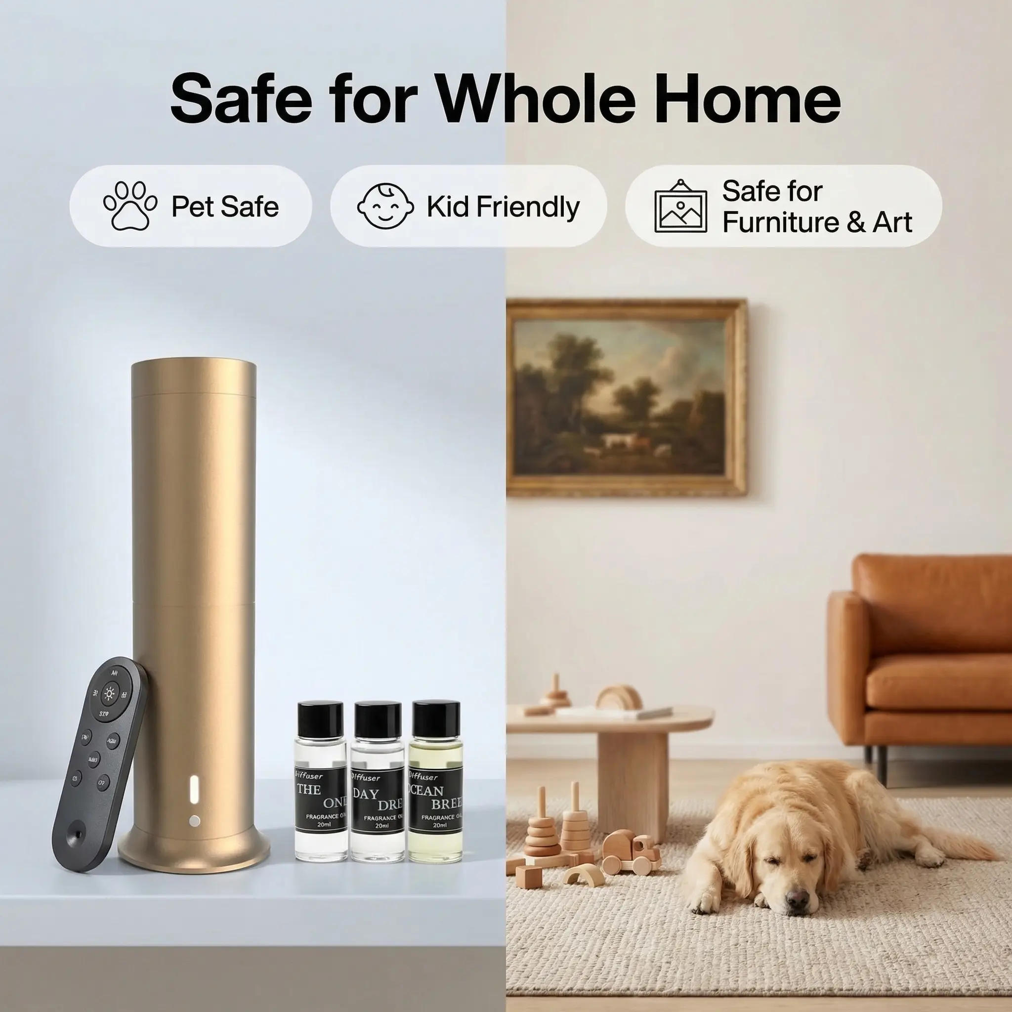 Ideal Application Scenarios Home Environments: Living rooms, bedrooms, bathrooms, and studies—create your own private sanctuary of tranquility, helping you achieve total relaxation or enhance your focus. Commercial Spaces: Hotel lobbies, car showrooms (4S dealerships), retail stores, and co-working spaces—elevate your brand image and spatial ambiance, leaving visitors with a memorable and delightful impression. Wellness Settings: Spas, yoga studios, and meditation rooms—enrich your mindfulness practice and deepen the therapeutic benefits for both body and mind. Why Choose Our Aroma Diffuser? Waterless Design—Clean and Hassle-Free: Say goodbye to the tedious chores of frequent water refills and limescale cleaning. Long-Lasting Scent: Utilizing waterless atomization technology, it ensures the fragrance lingers 2 to 3 times longer than with traditional diffusers. Energy-Efficient: Operates on low power consumption, allowing for safe, continuous use over extended periods. Complete Set: Transform your space into a sensory sanctuary right out of the box. Our "Smart Tower Aroma Diffuser" is ready to use immediately upon purchase—no additional accessories required. Let every wisp of fragrance elevate your breathing experience and immerse you in a sense of pure luxury.