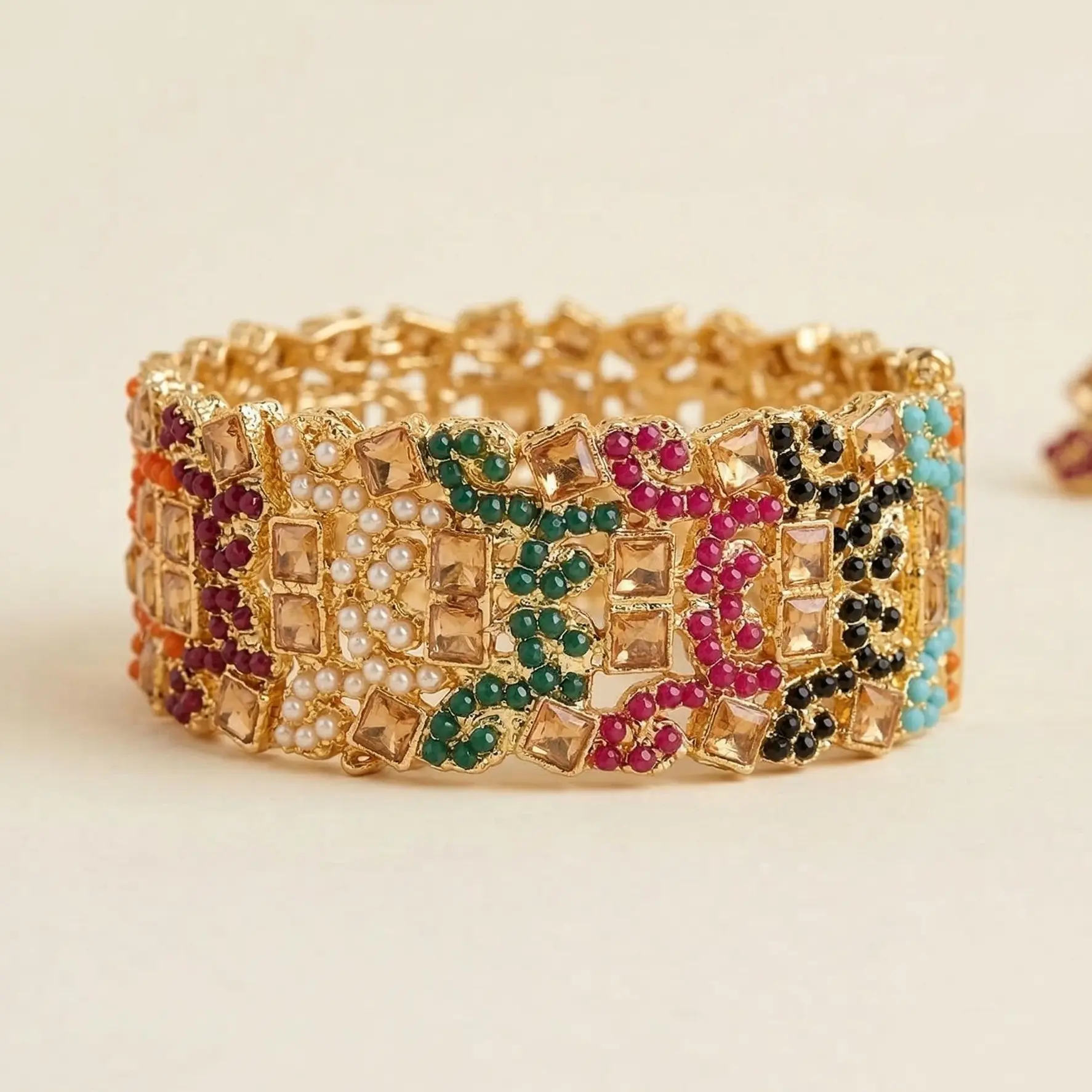 Turn heads at every event with this bold and elegant statement bangle. Designed with high-quality gold plating and beautifully set colorful gemstones, this piece adds instant luxury to any outfit.