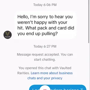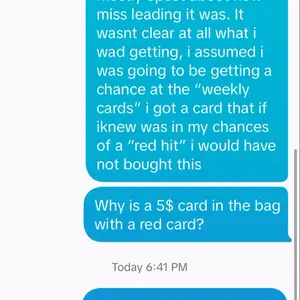 Im kinda annoyed!! I ONLY purchased because they said “in this weekly line up” i bought for that week and got a bad card out of a “hit” package THATS WASNT IN ANY OF THE LINE UPS. I pulled a bad booster pack, i was actually hoping the horrible hit card would come with a colctr pack but OFC NOT. Dont