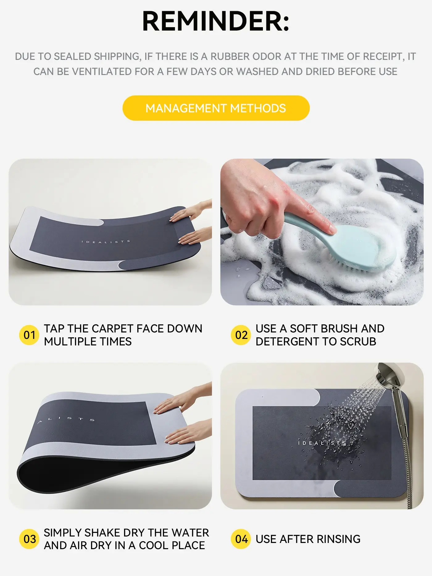 The feel is great, the craftsmanship is fine with no odor, and overall, I'm extremely satisfied. The color matches the picture perfectly with no deviation, and the tone goes well with various home decor styles. It feels amazing to step on barefoot, and the non-slip design on the bottom is very thoughtful. It stays in place on the floor without shifting, and the craftsmanship is fine with no odor. Highly recommended!