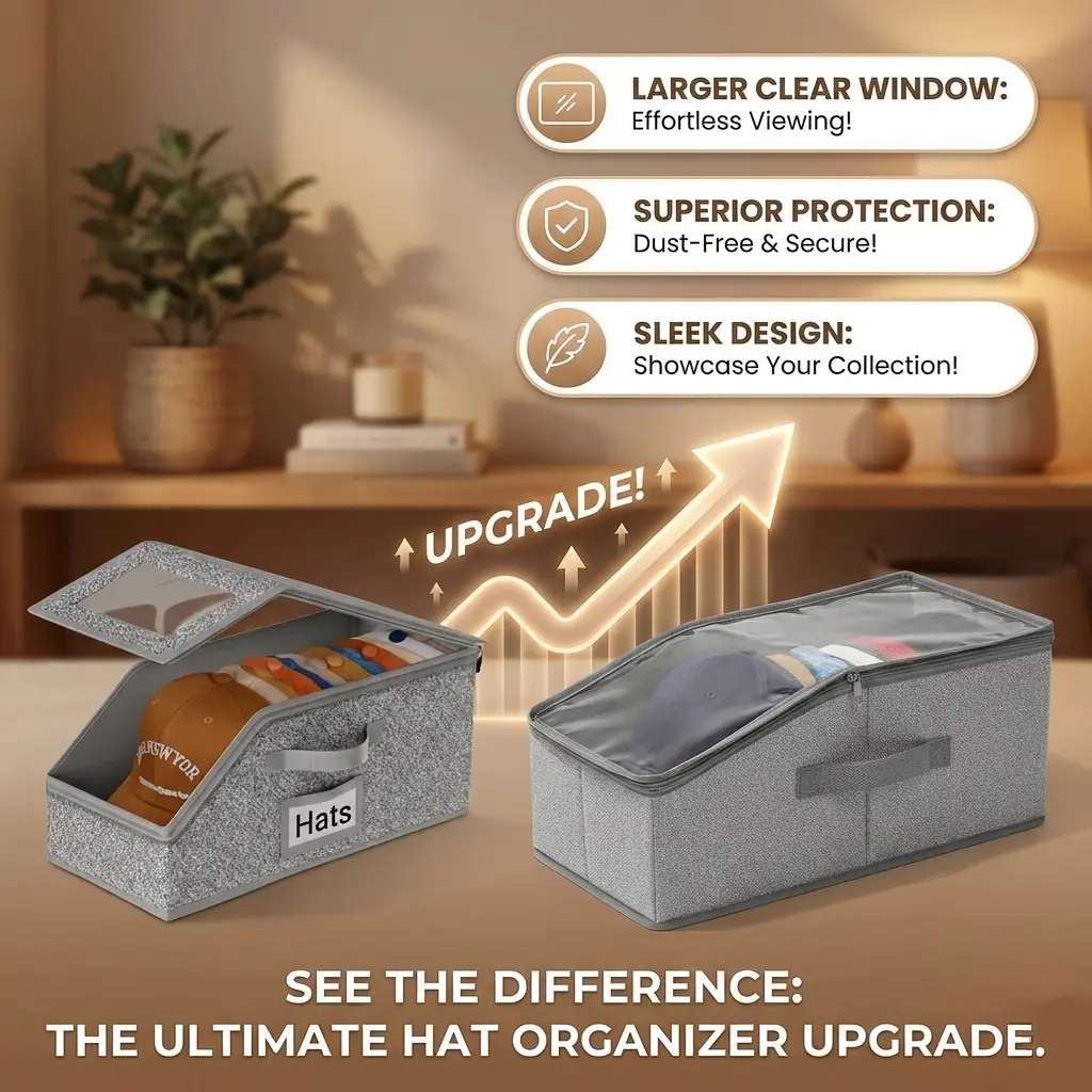 ·See Your Style at a Glance: Featuring a classic exterior and a brand-new, extra-large clear window. This upgraded hat organizer blends seamlessly into your home, keeping your collection visible and pristine. 🌟