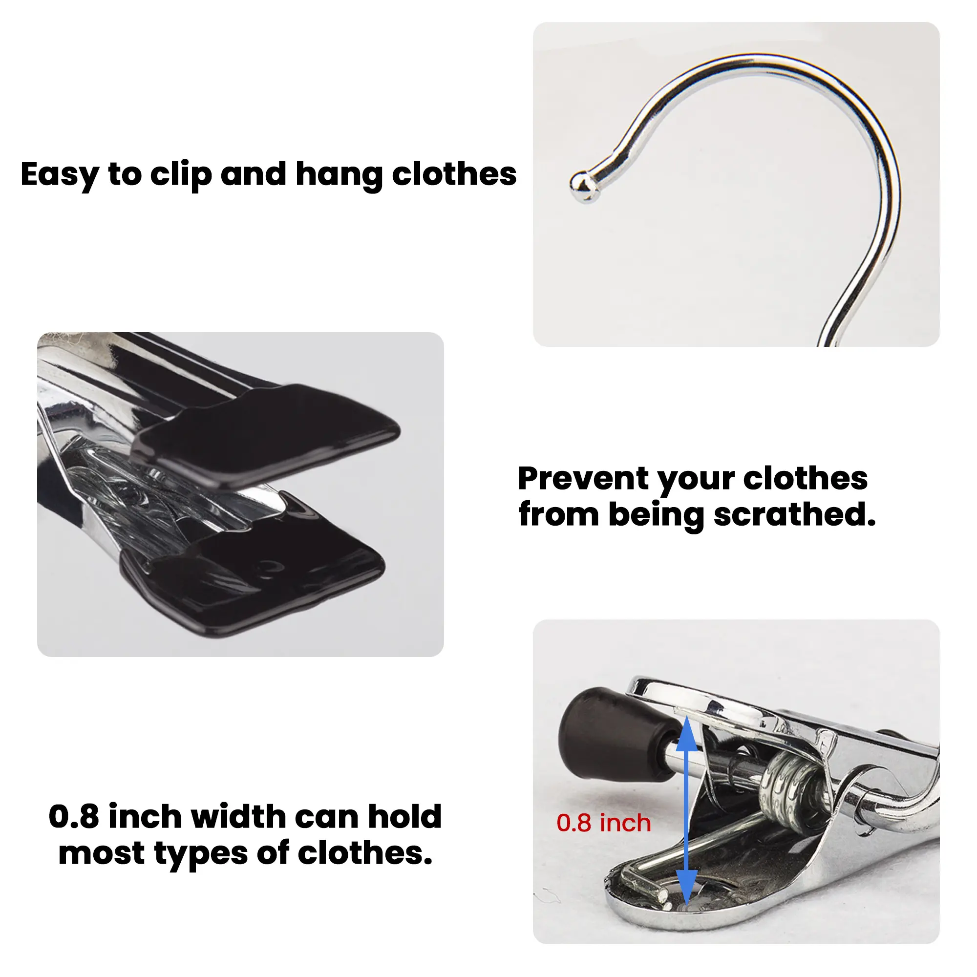 No Scratch and No Wrinkle: These hanger clips have a smooth rubber coating on the bottom and hook ends of the clips, which are perfect for hanging delicate fabrics or leather without any scratched or snagging. Even if used for a long time, it can still protect your clothes very well