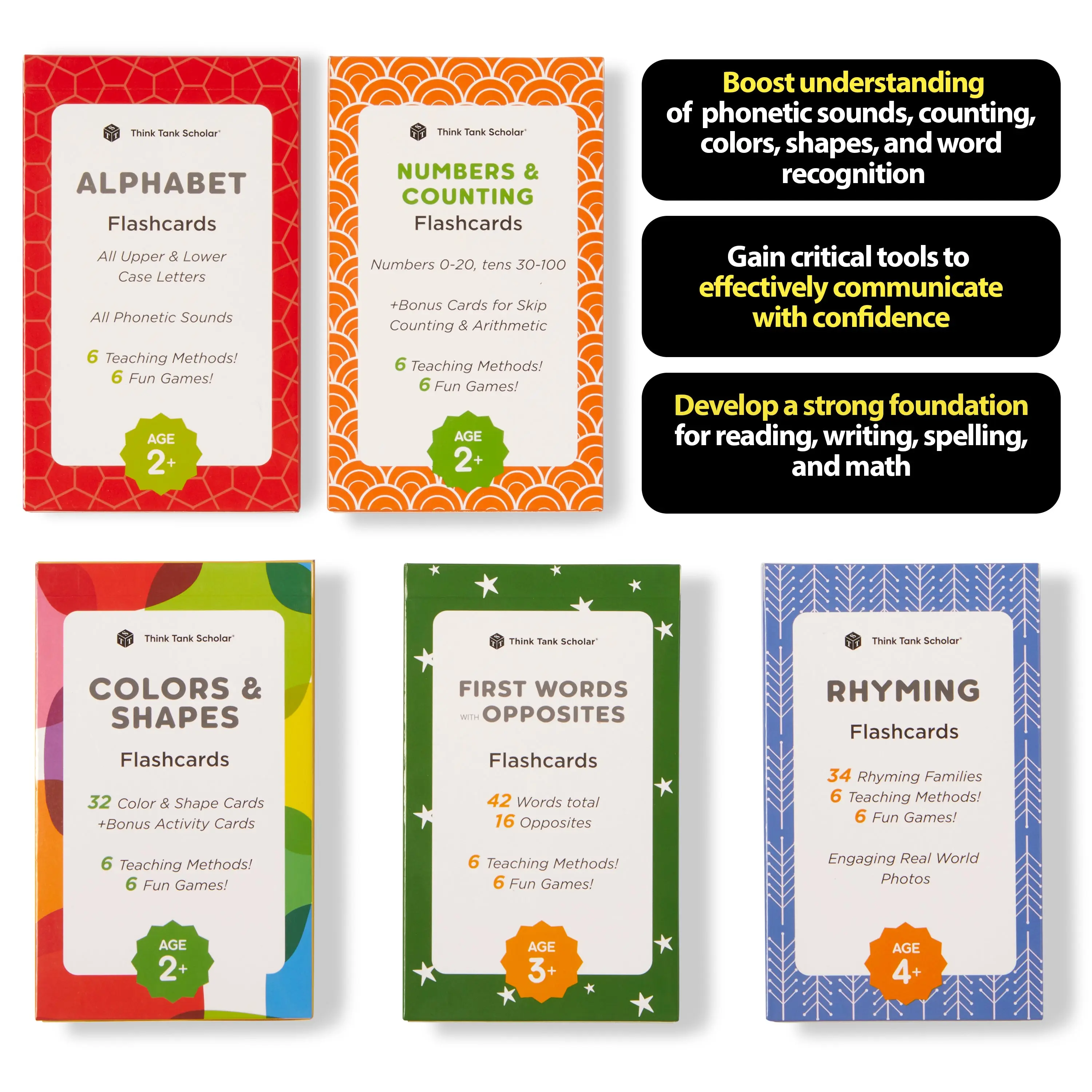 ·✅ Comprehensive Alphabet, First Words & Opposites, Colors & Shapes, Numbers & Counting, and Rhyming flashcard sets for children ages 2 years through Preschool, Pre-K, Kindergarten and Grade 1 by parent endorsed and academic award-winning Think Tank Scholar.