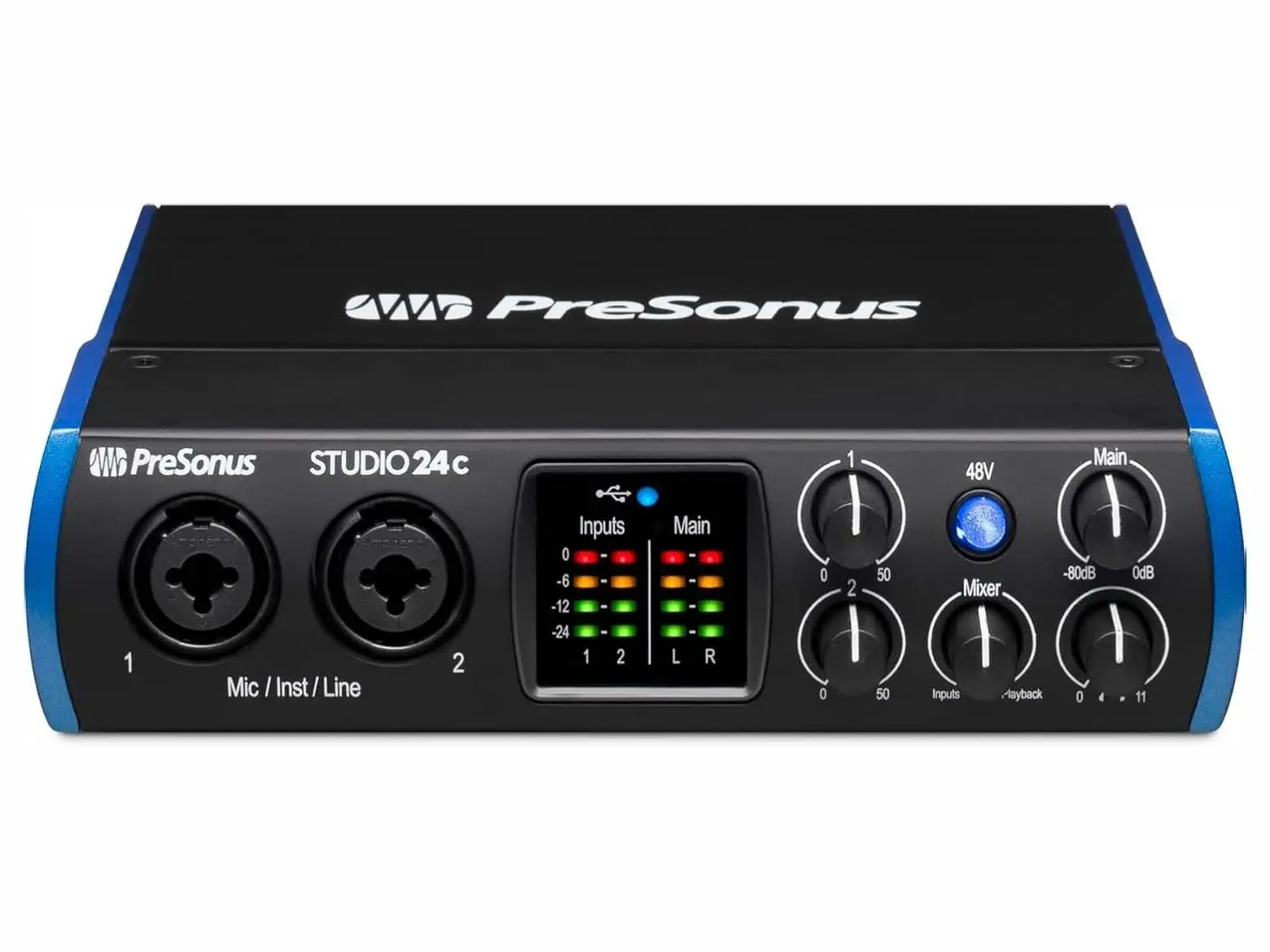 Ever dreamed of a pro studio setup that fits in your backpack? The PreSonus Studio 24c makes that dream real with its sleek, compact 2x2 USB-C audio interface. Whether you’re a musician, podcaster, or content creator, this device captures every nuance with its XMAX-L solid-state mic preamps and studio-grade converters supporting up to 24-bit/96 kHz recording. No need to lug around extra power bricks—the bus-powered design means you just plug it into your laptop and start creating. The interface includes handy ladder-style LED level meters and low-latency direct monitoring, so you stay in control without annoying delays. It also offers versatile inputs for mics, instruments, and line-level gear, plus 48V phantom power for your condenser mics. MIDI I/O lets you connect keyboards or other gear seamlessly. To kickstart your creativity, you get Studio One Artist and Ableton Live Lite DAWs bundled in, along with the Studio Magic Plug-In Suite valued over $1,000. Inside the box, you’ll find the Studio 24c interface, USB-C to C and USB-C to A cables, and software download instructions. Ready to elevate your home studio or mobile setup? Plug in, power up, and let your creativity flow with the PreSonus Studio 24c!
