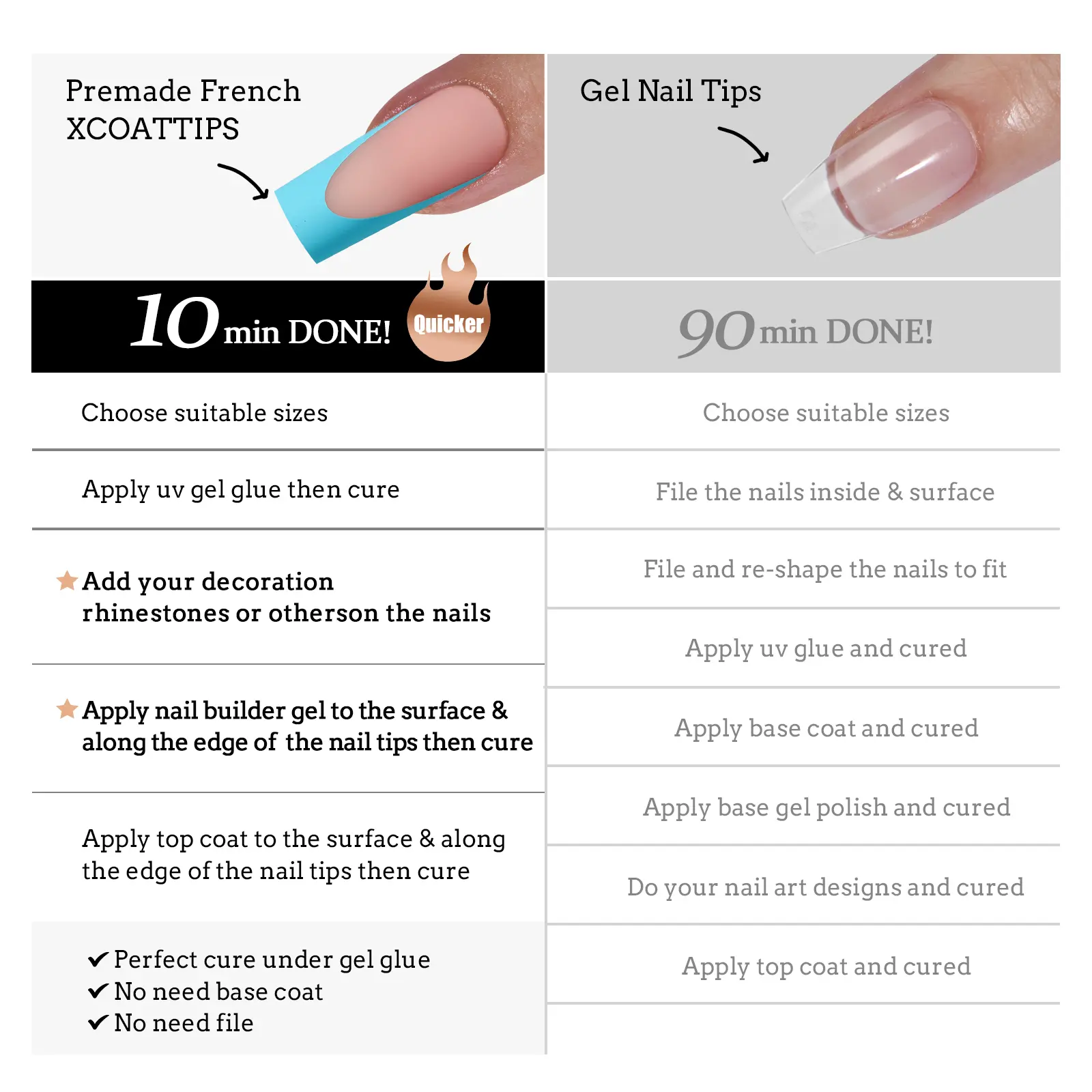 Shipping was very fast. The quality of the nails are great. The nails are thick and as pictured. This was my first time so it was trial and error but they came out great..