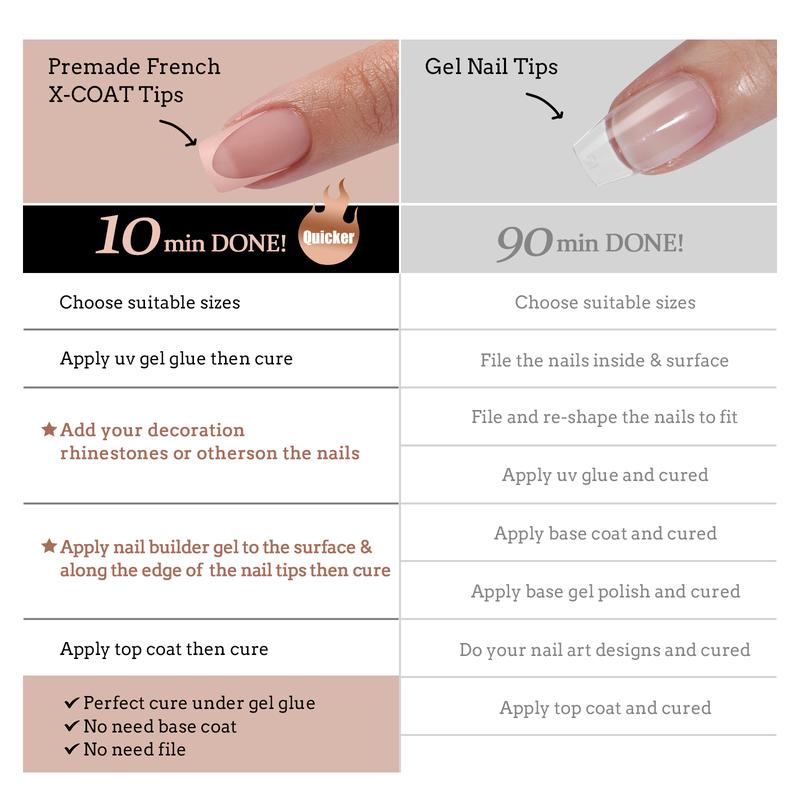 ·PATENTED X-COATTM PROCESS: Proprietary technology for these long square nail tips allowing ultraviolet rays through tips and curing the gel glue or solid gel glue, even after the French/ombre/gradient/cat eye design process.