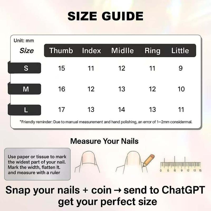 Nail sizing may vary slightly based on individual nail shape and curvature. A 1–2mm variation is normal.