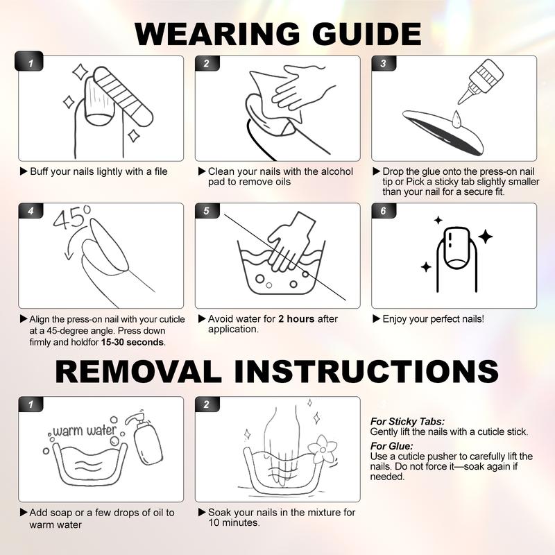 ·Premium Nail Glue & Sticky Tabs (24 pcs): Provide you with long-lasting adhesion or temporary but secure hold!