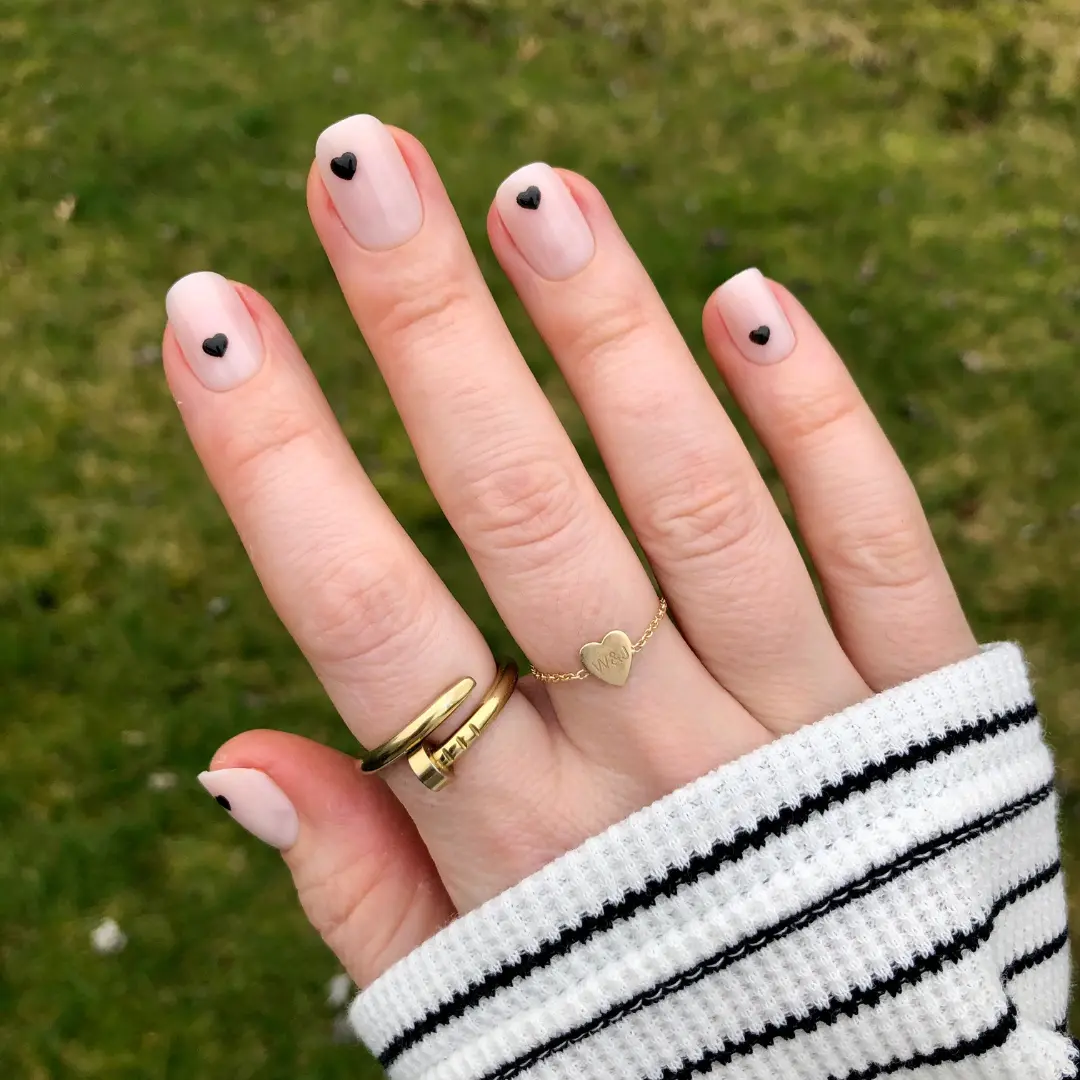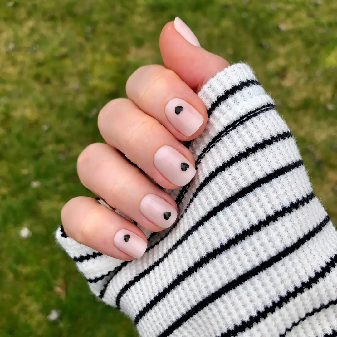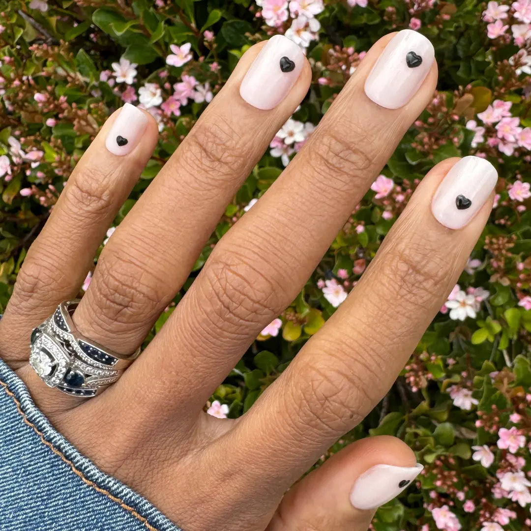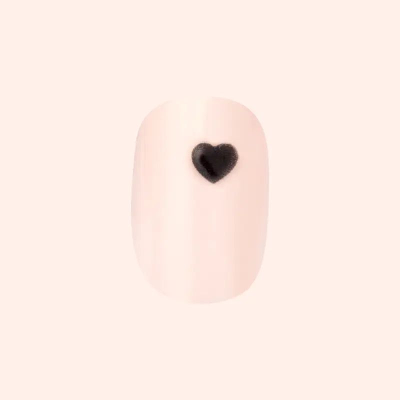 A neutral mani accented by 3D puffy dark hearts in an extra short squoval shape.“Seeing one of our first press-on designs in this amazing 3D effect is a full circle moment.” XO SGT