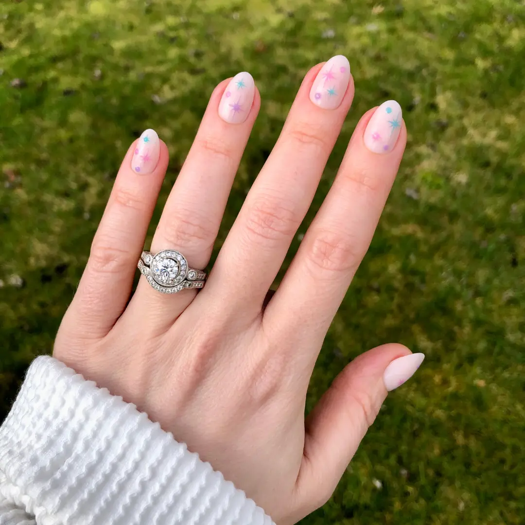 A sheer neutral mani with candy-colored sparkles in a short almond shape.“Yes I will be wearing these for any and all parties I am invited to.” XO SGT