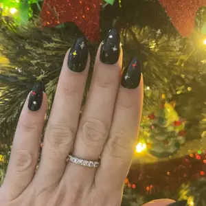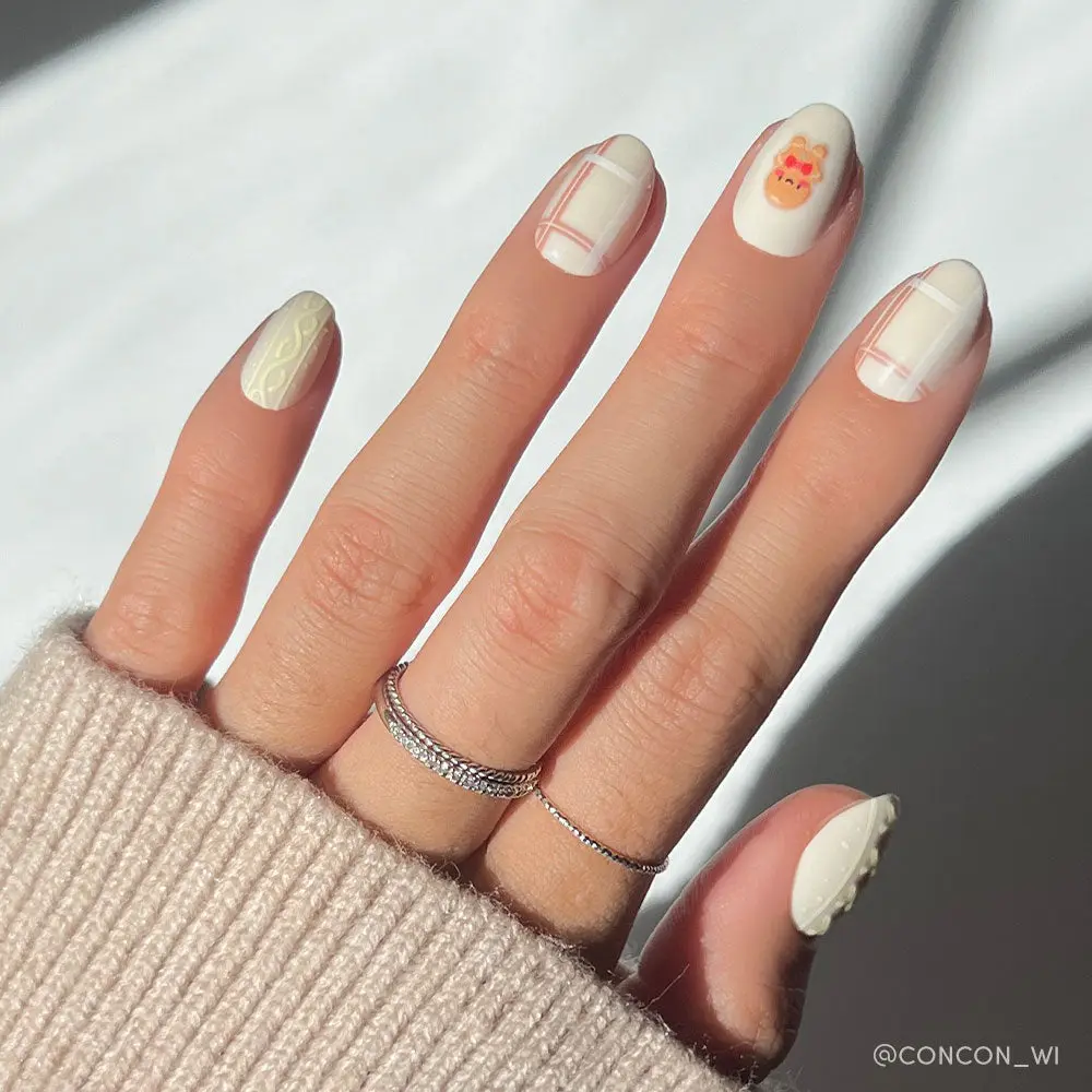 Winter Comet features solid black short almond nails with multicolor 3D gems, perfect for a starry, elegant vibe. Gingerbread Knit offers playful short ovals with 3D patterns in glossy and matte finishes for a cozy holiday feel.
