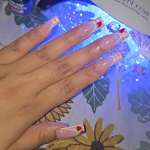 These DIY nails look pretty and seem durable after UV curing, though curing took longer than the 60–90 seconds recommended. Applying rhinestones and holding nails under the light was tricky. One nail fell off within an hour, but others stayed on. Whole process took over 1.5 hours.