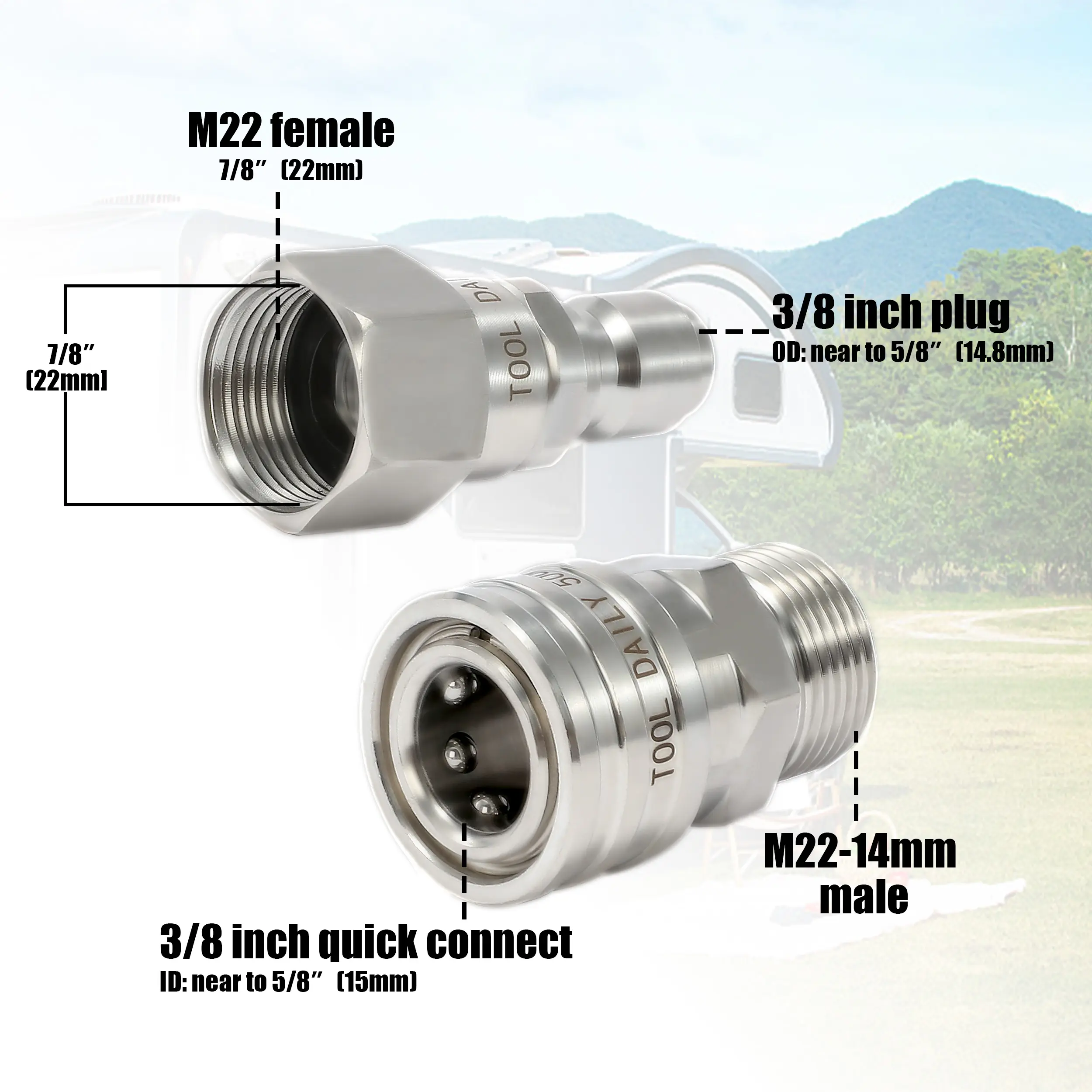·PACKAGE INCLUDE: 2 count adapter (M22 14mm female to 3/8" quick connct plug swivel); 2 count adapter (M22 14mm male to 3/8" quick connect socket).With these pressure washer swivel adapters, you can expand the functionality of your pressure washer and tackle a wider range of cleaning tasks.