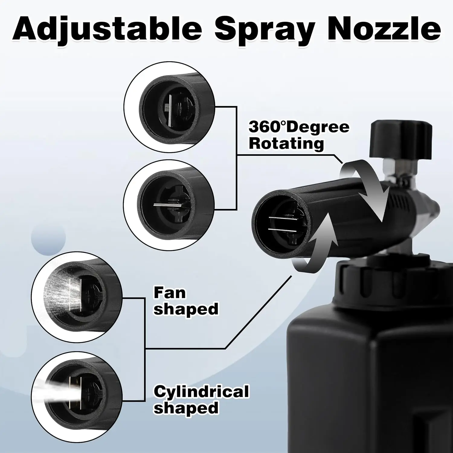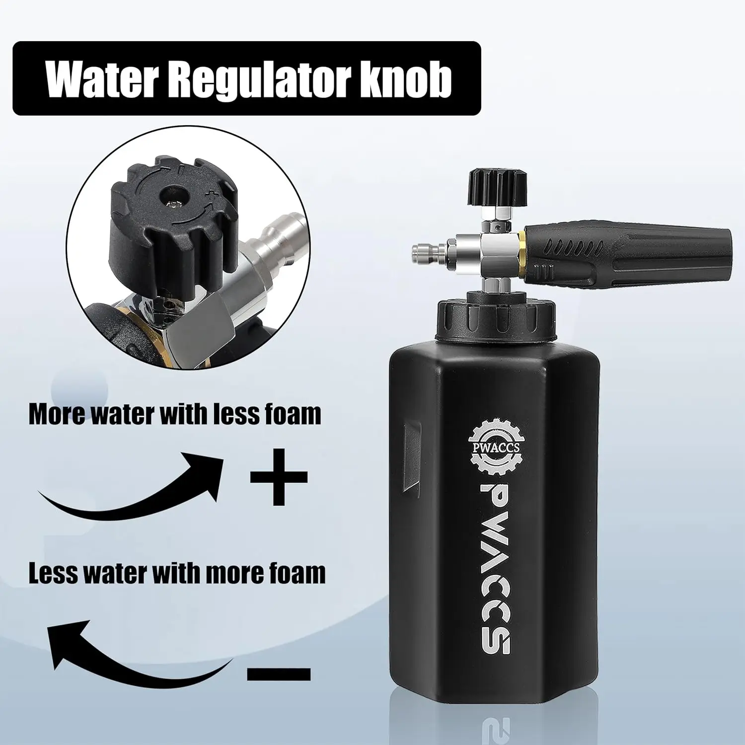 ·ADJUSTABLE FOAM SPRAYER - The adjustable nozzle ensures the ideal spray pattern, while the water regulator knob controls water and foam mix. The nozzle holder rotates 360 degrees to tweak the direction. Snow foam cannon makes car washing faster, reducing the amount of time and effort required for cleaning.