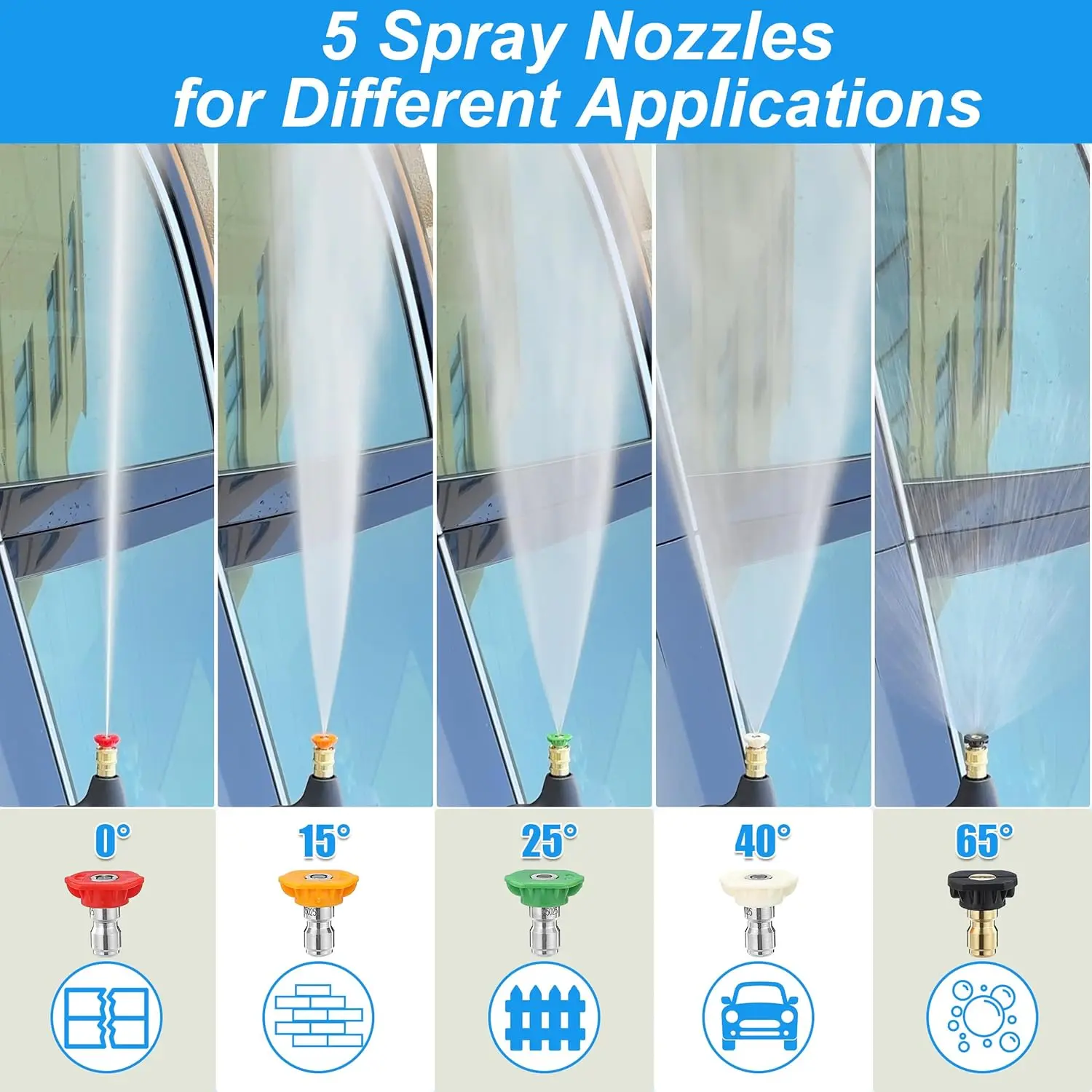 Perfect for washing cars, vehicles, cleaning windows, driveways, floors, roofs, and stubborn stains. The kit includes five nozzle tips with different angles (0° to 65°).