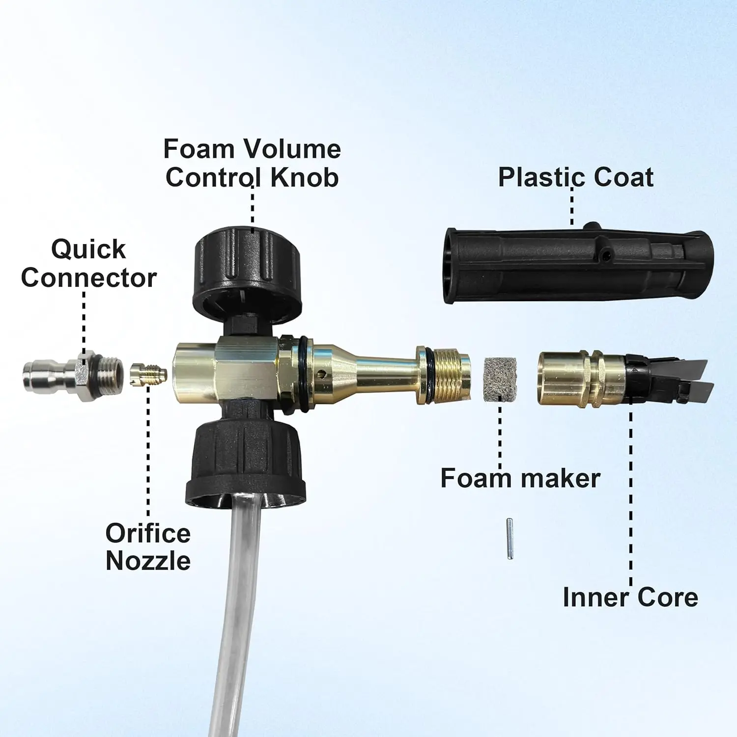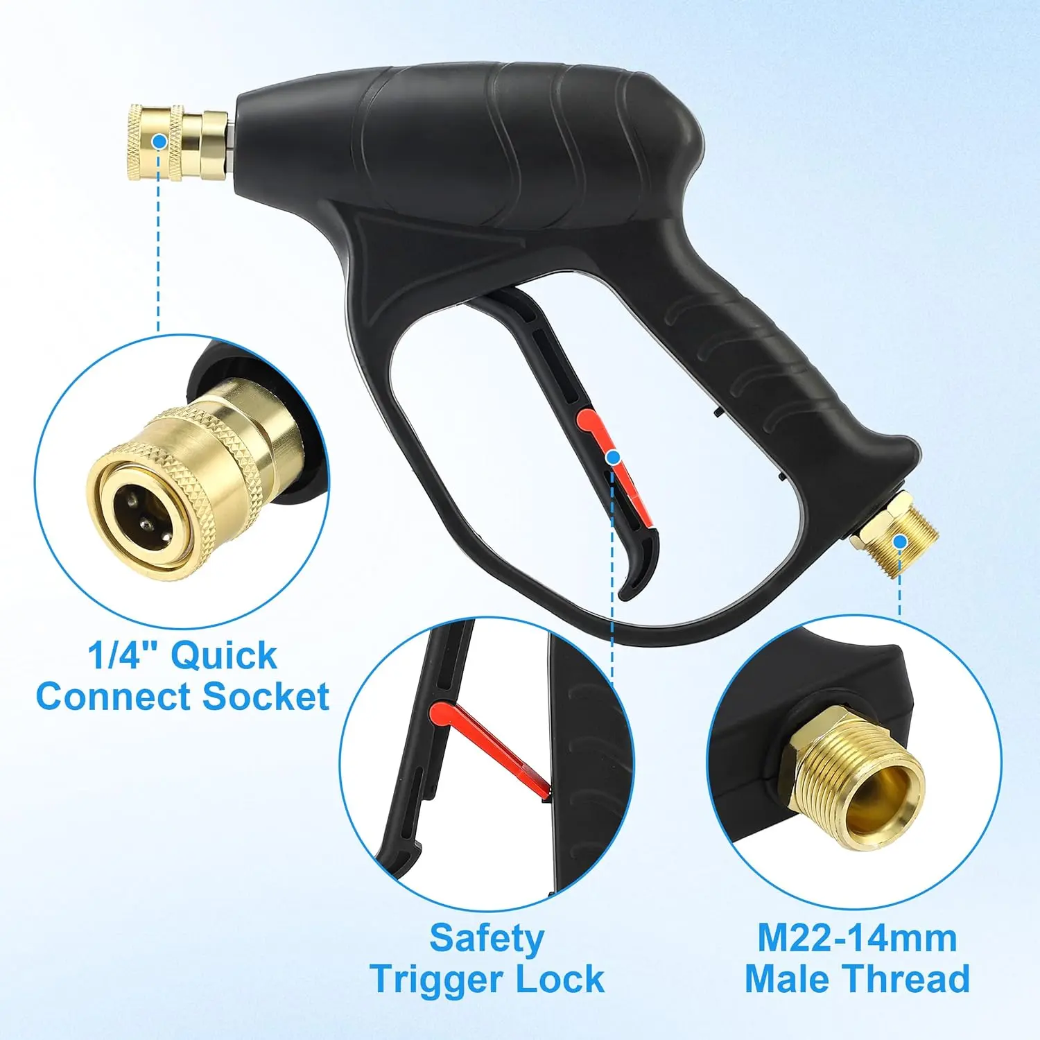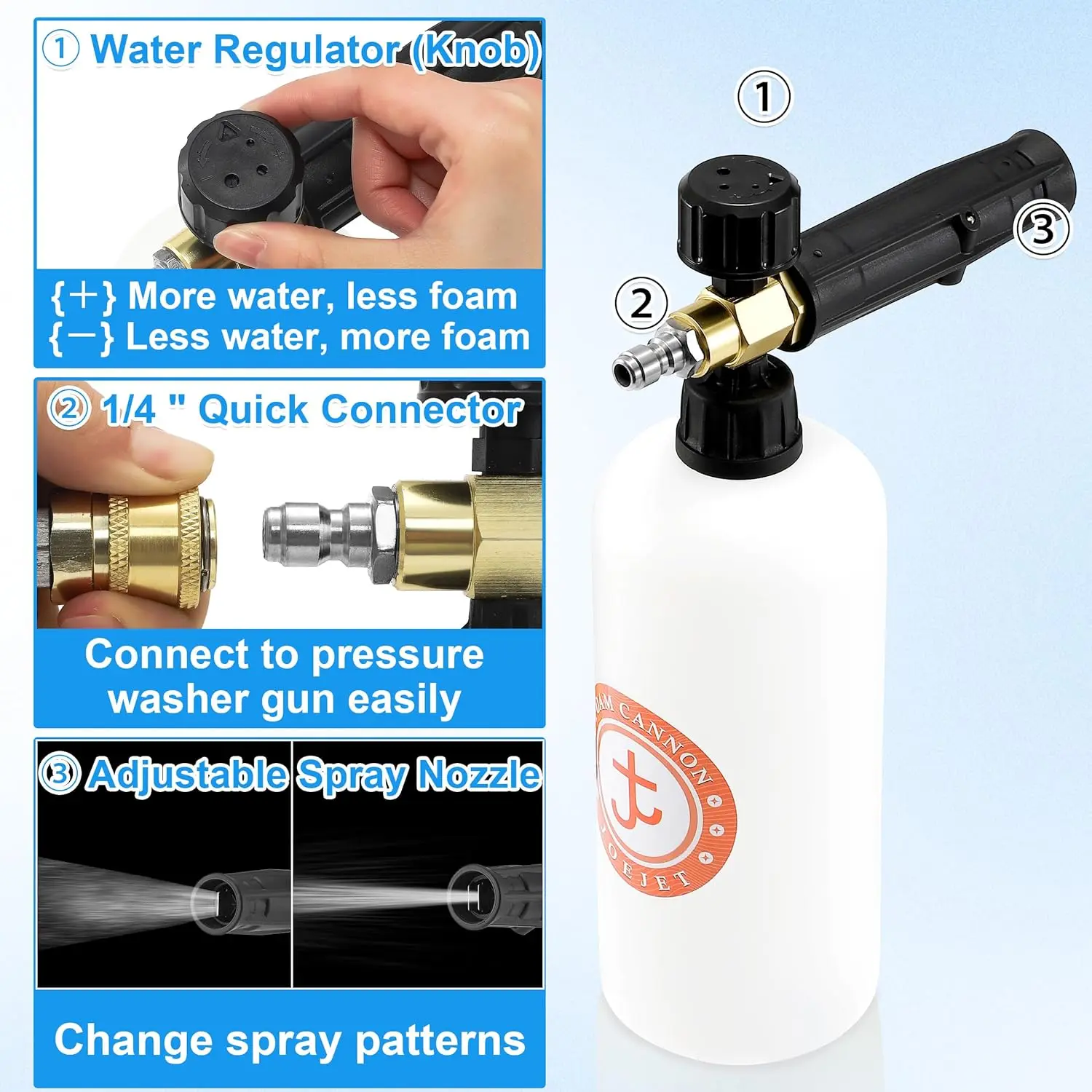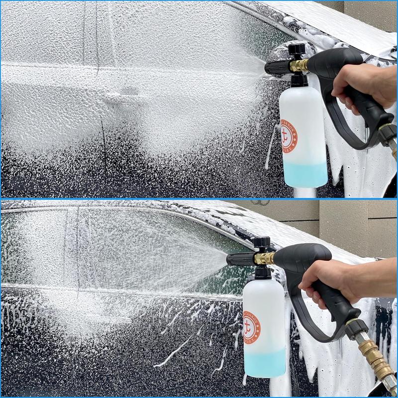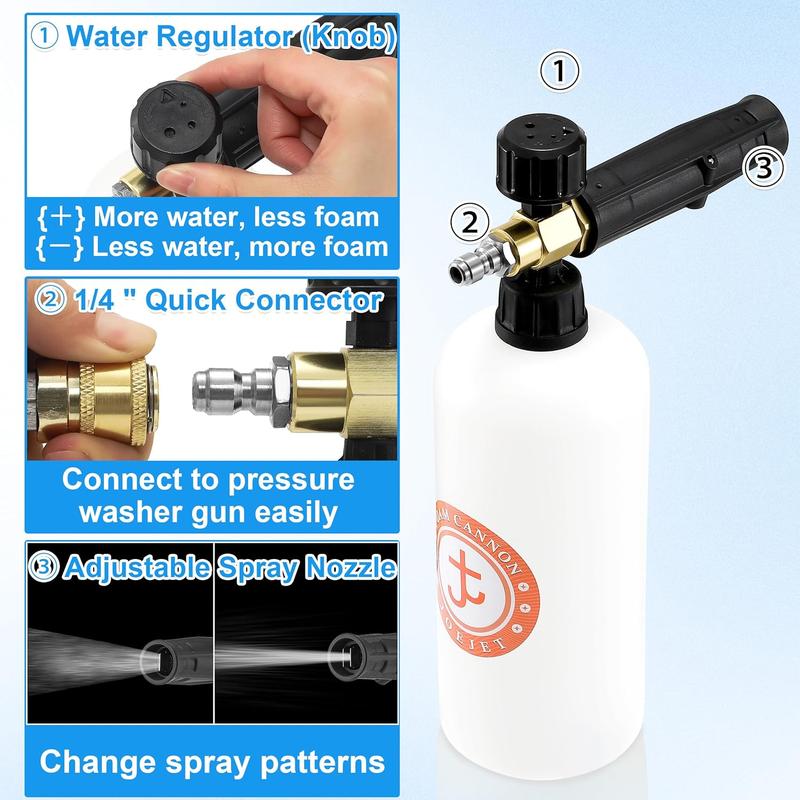 Connect with a 1/4-inch quick connector for a secure fit. Adjust the spray pattern and foam concentration effortlessly. The comfortable handle reduces hand fatigue, and the safety trigger lock prevents accidental spraying.