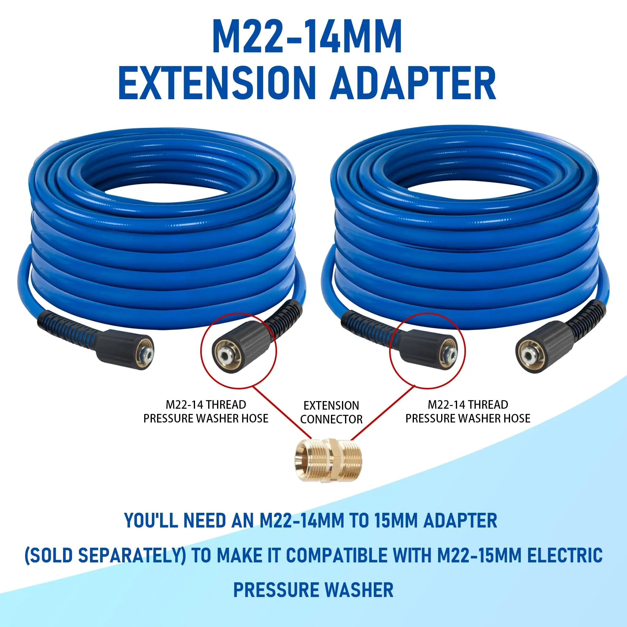 ·Fully Equipped: The package includes a power washer hose and 5 adapters to deal with most cases. The set contains 2 x M22-14mm female x 3/8" plug, 2 x M22-14mm male x 3/8" quick connector, and 1 x M22-14mm male x M22-14mm male