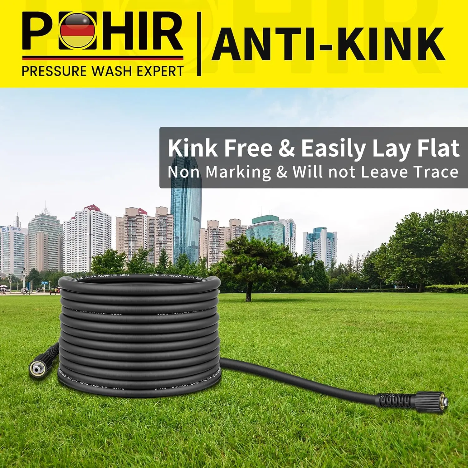 ·Kink Resistant Pressure Washer Hose – Power hose 50 ft is made of upgraded material which greatly improved the kink resistance, super easy to carry, drag, stretch out and roll-up. Max working pressure rated at 4000 PSI, burst pressure at 11000 PSI. Max temperature for water is up to 140℉/60℃.