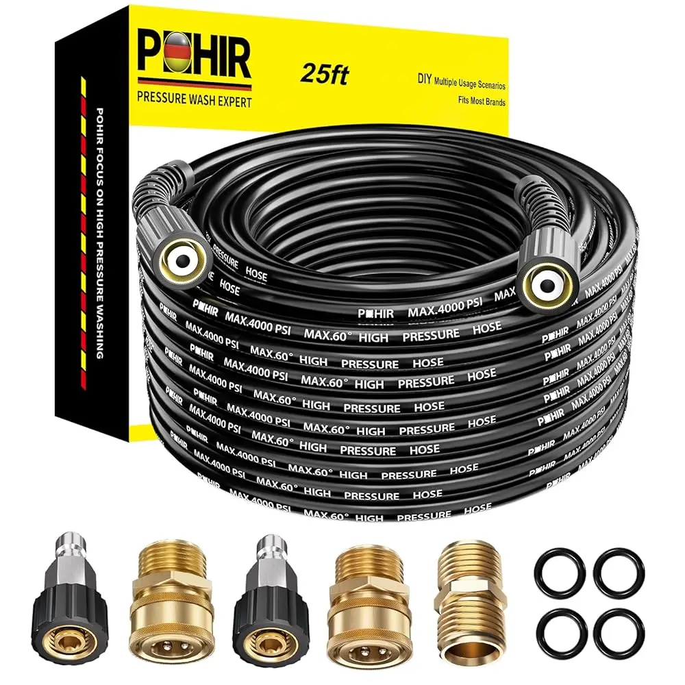 ·Pressure Washer Hose Kit – 1 x M22 pressure washer hose with 14mm thread, 2 x M22-14mm female to 3/8" plug, 2 x 3/8" quick disconnect to 14mm male, 1 x M22 14mm male to male, 4 x O rings. Easily hook up to power washers and guns. Fits most brands of pressure washers.