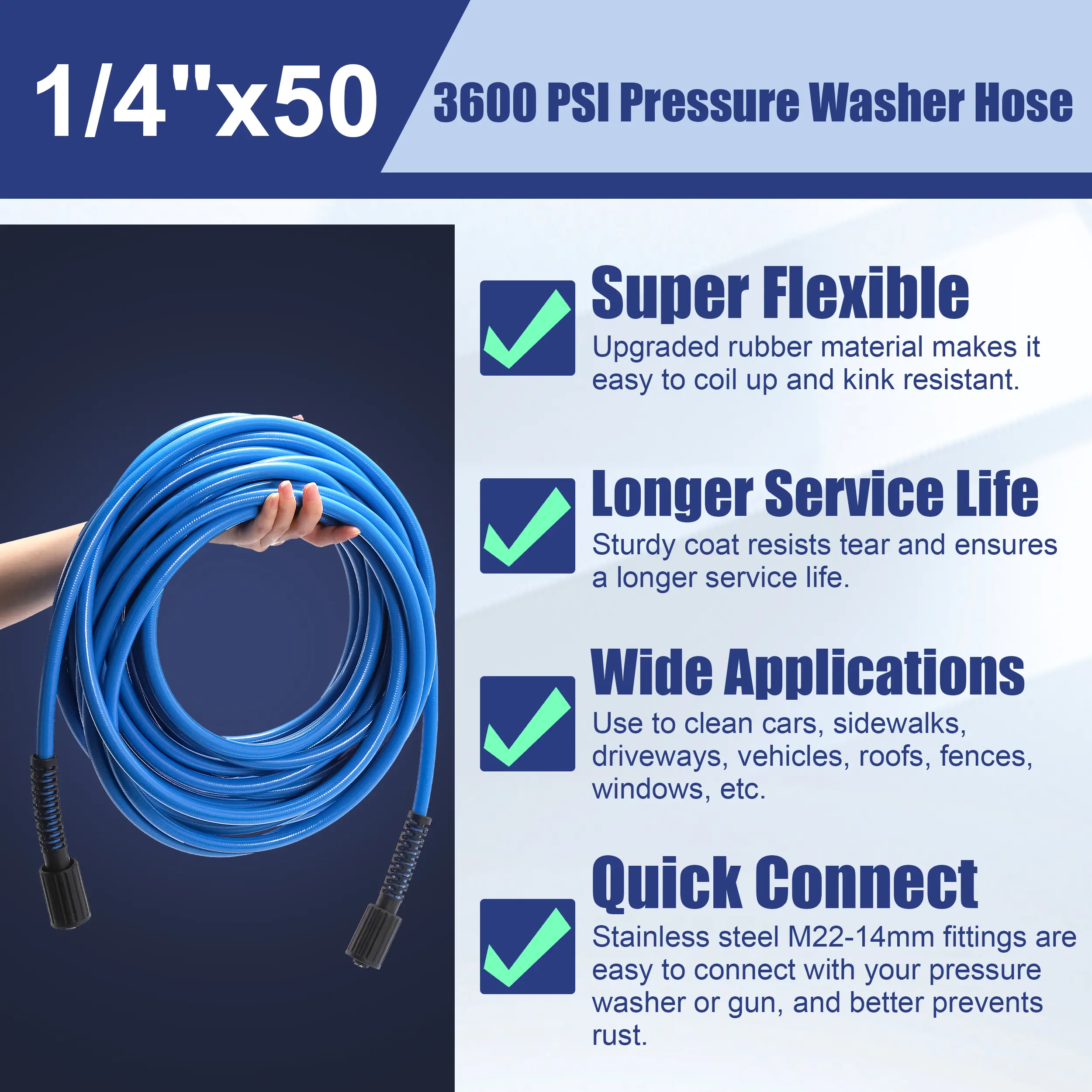 ·3600 PSI 50 ft pressure washer hose, M22 female thread, compatible with most brands of pressure washers on the market.