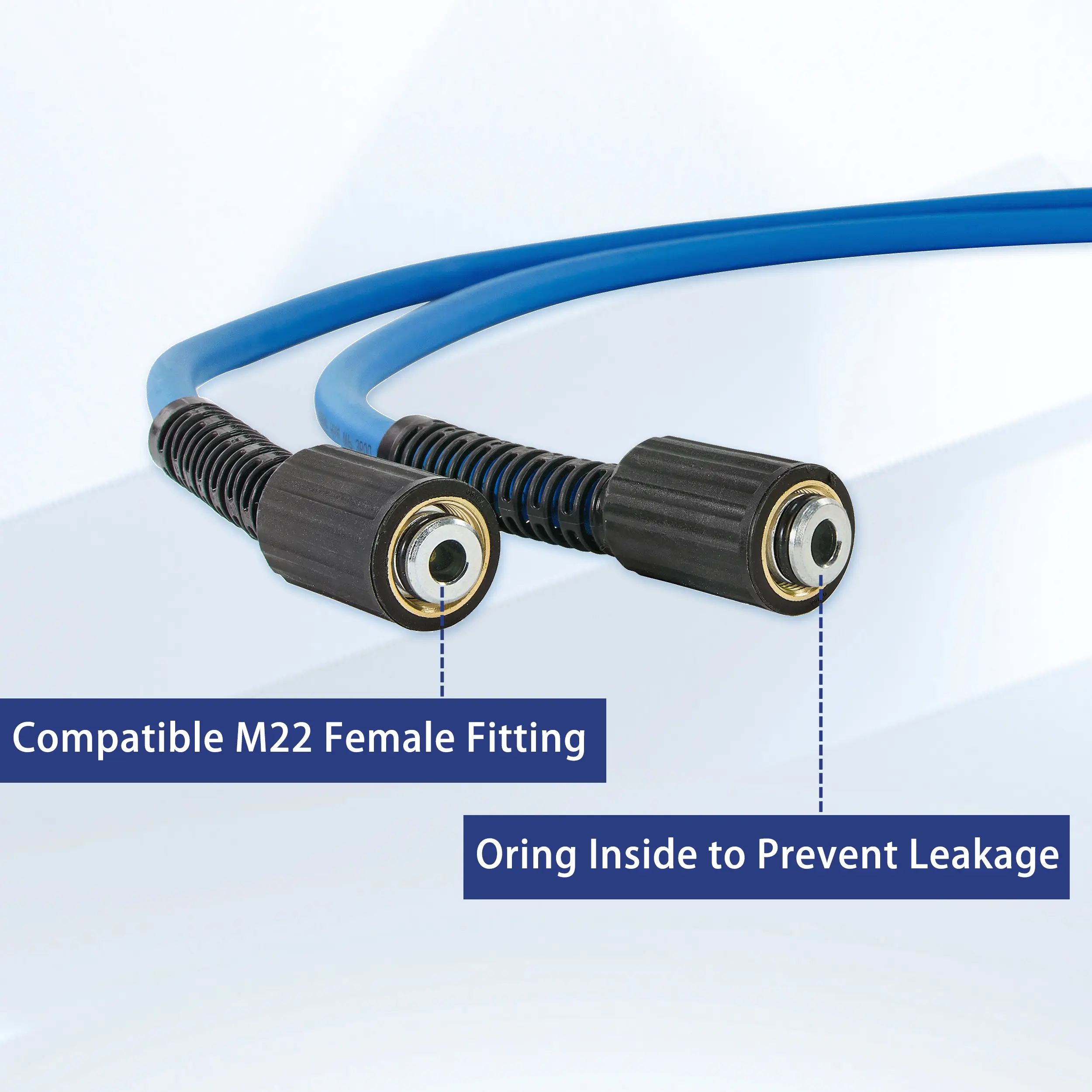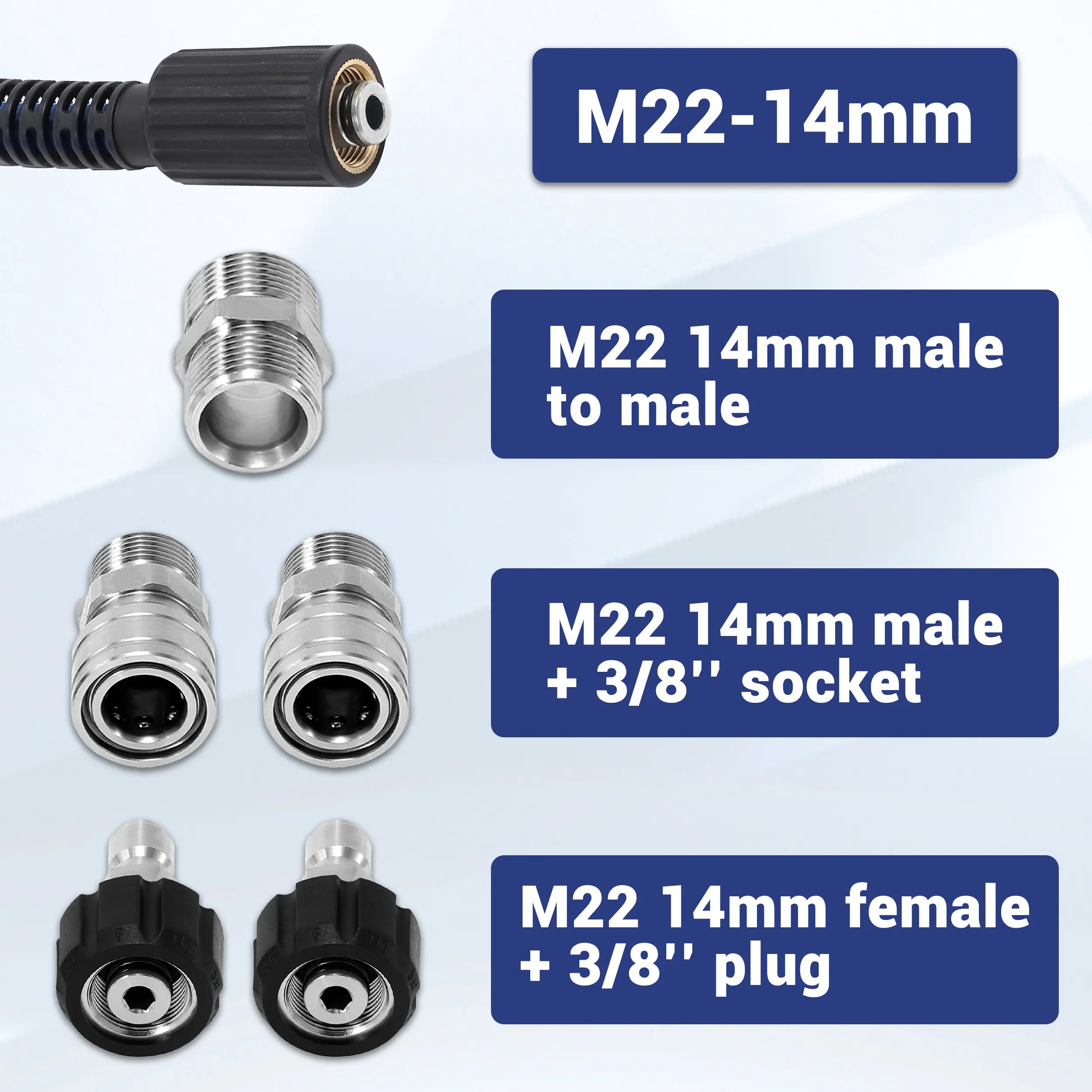 ·An M22 compatible 50/100 feet high pressure washer hose, a coupler (male M22-14mm) and two adapter sets (female M22-14mm + 3/8” plug, 3/8” quick disconnect + male M22-14mm)