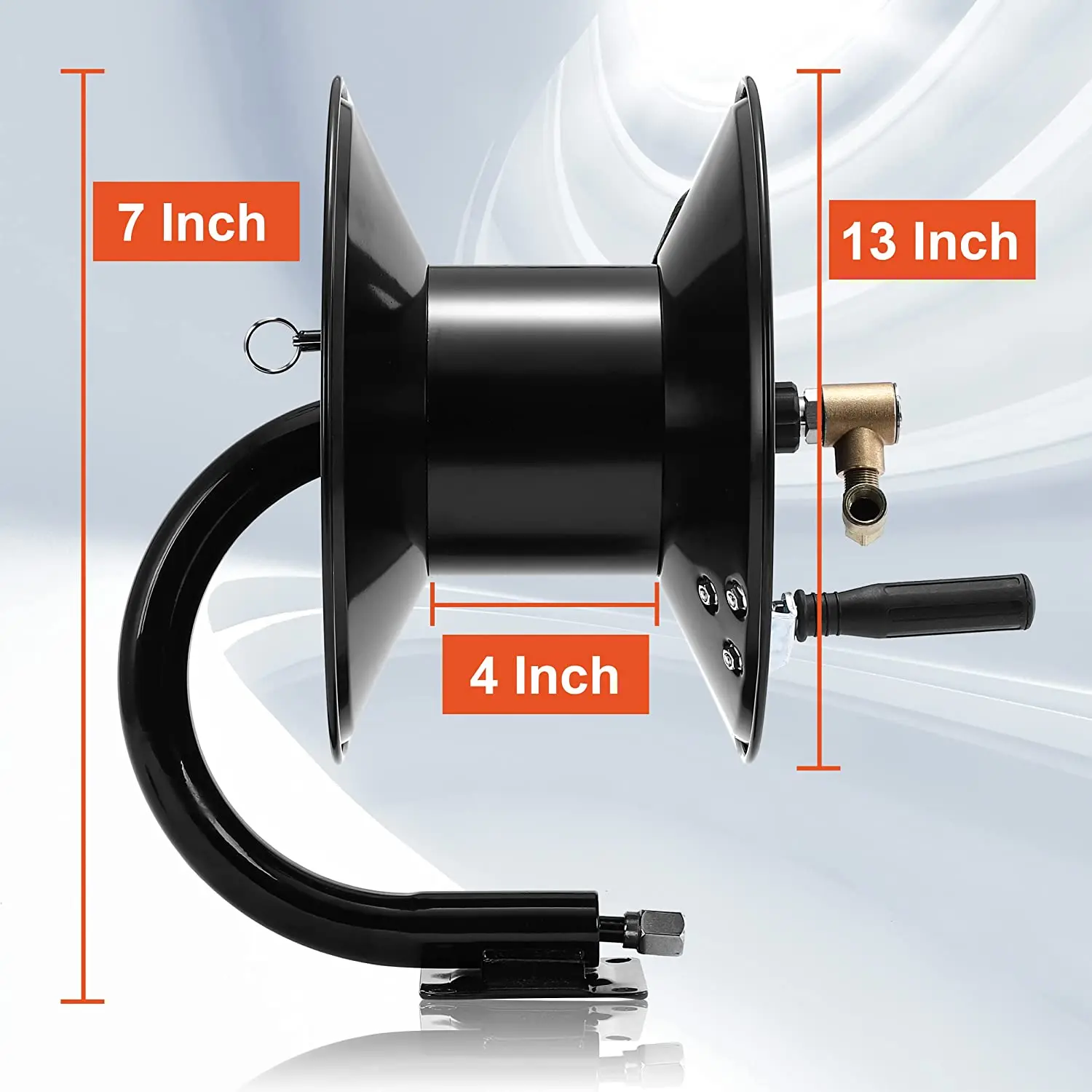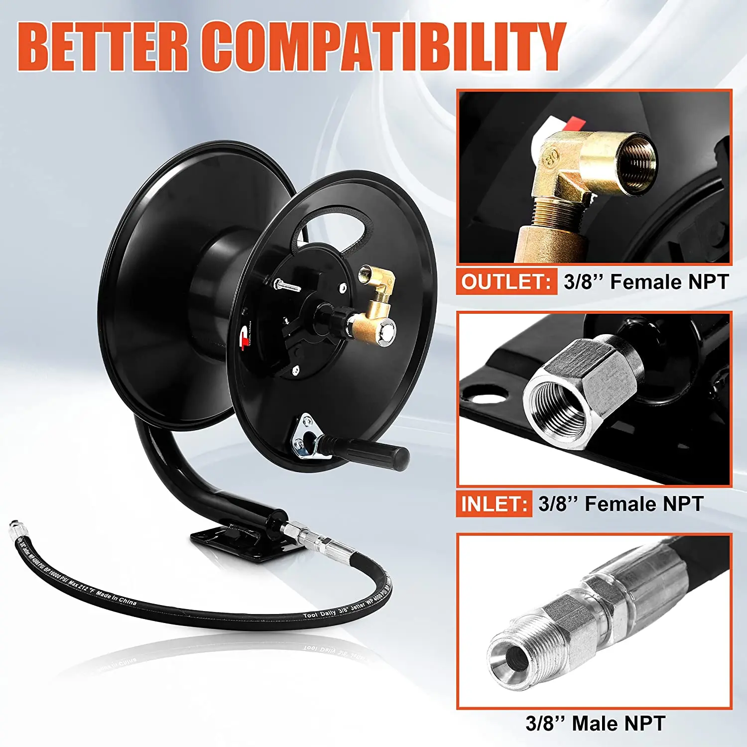 ·Specifications: Pressure washer reel is capable of holding 100 feet of hose (not included), with a max PSI of 4000 . It is compatible with 3/8" NPT male end and M22 female end.