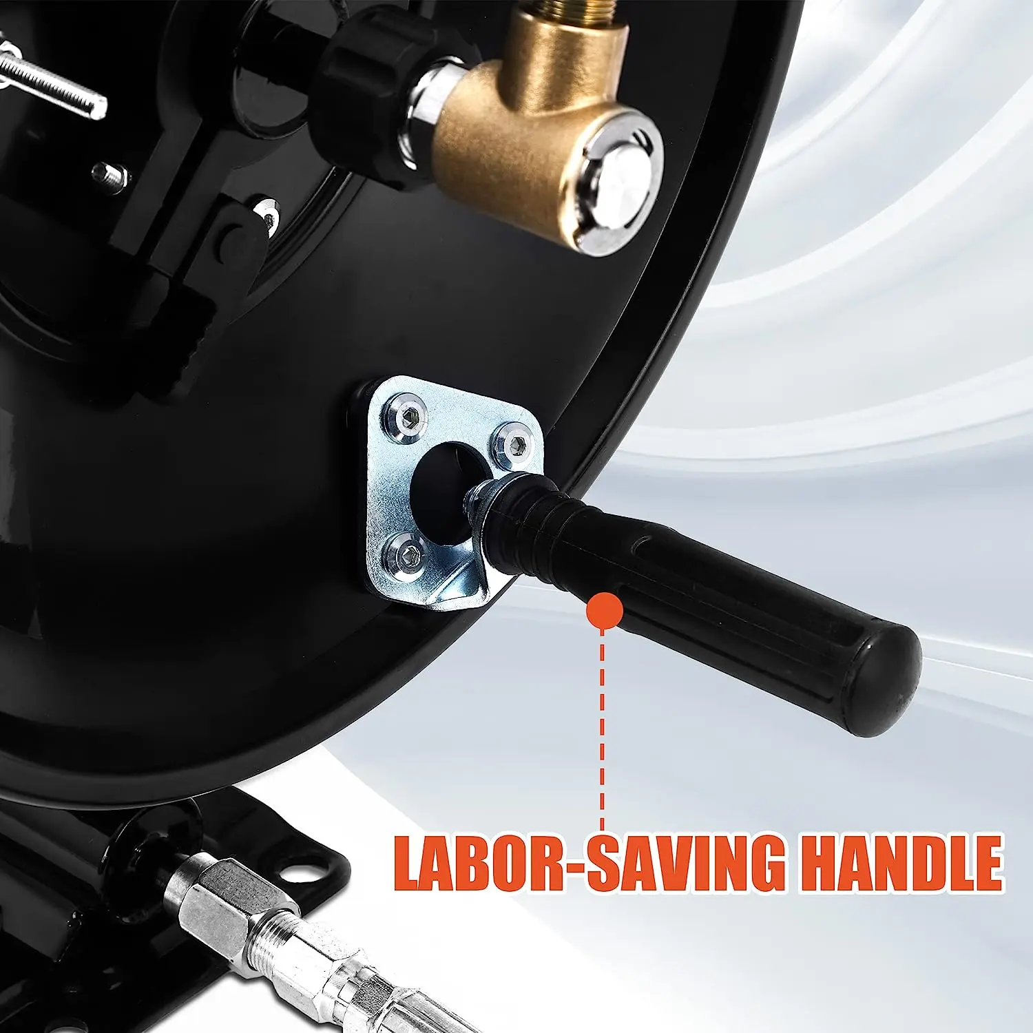 ·Upgrade Power Washer Hose Reel: Heavy duty industrial steel frame hose reel made of high quality material, with a corrosion resistant coating and a reinforced version hose inlet. Effectively prevent leakage and realize the durability of the product.