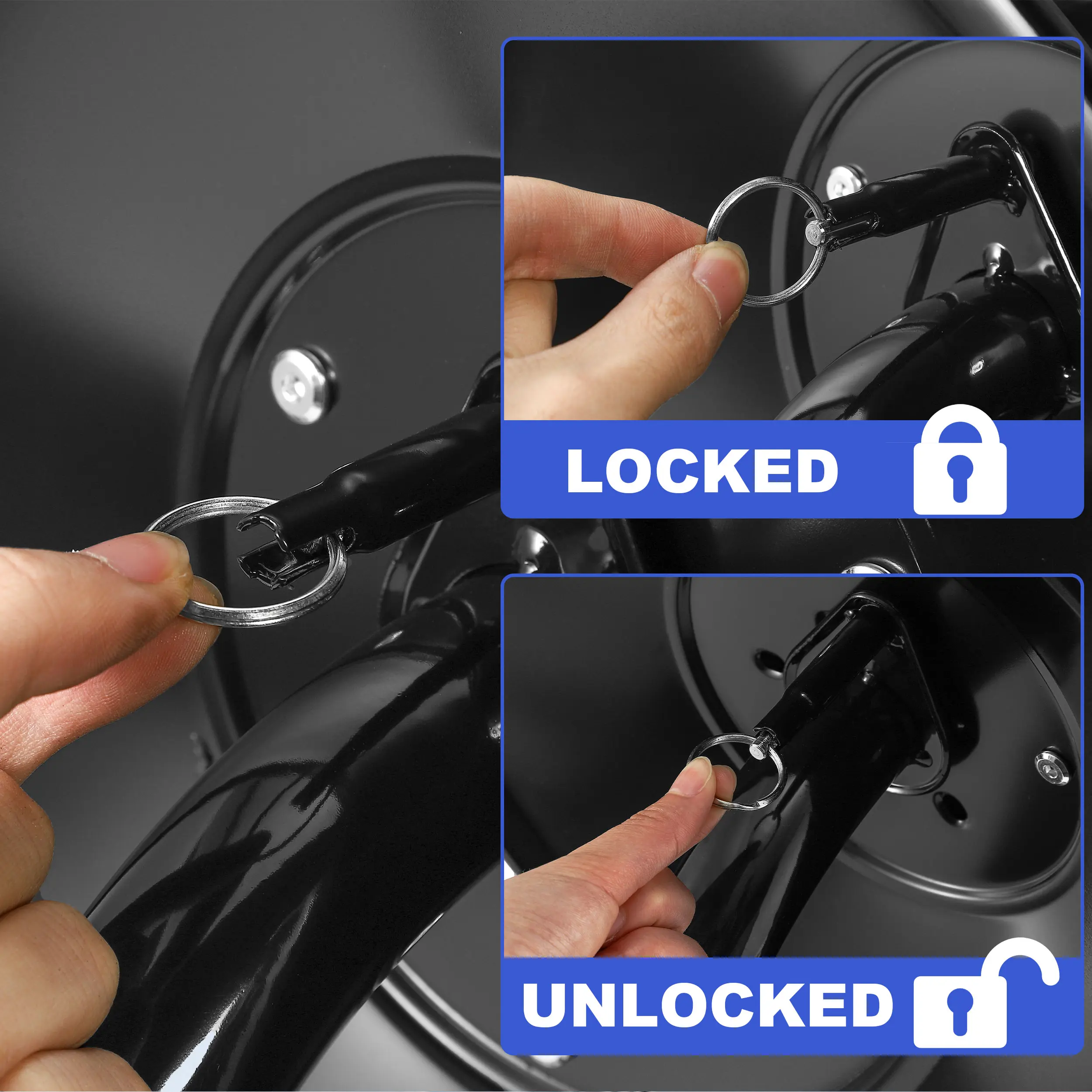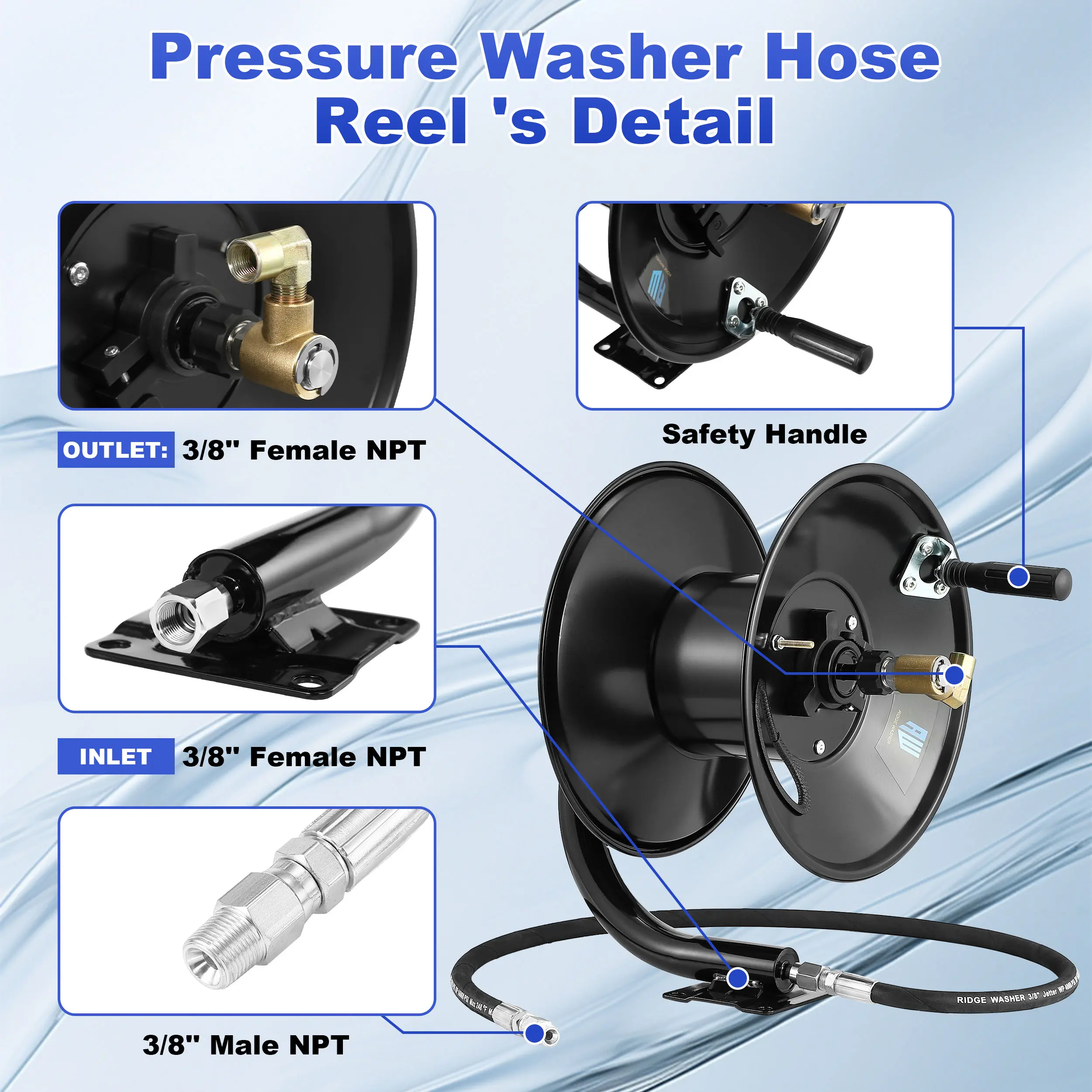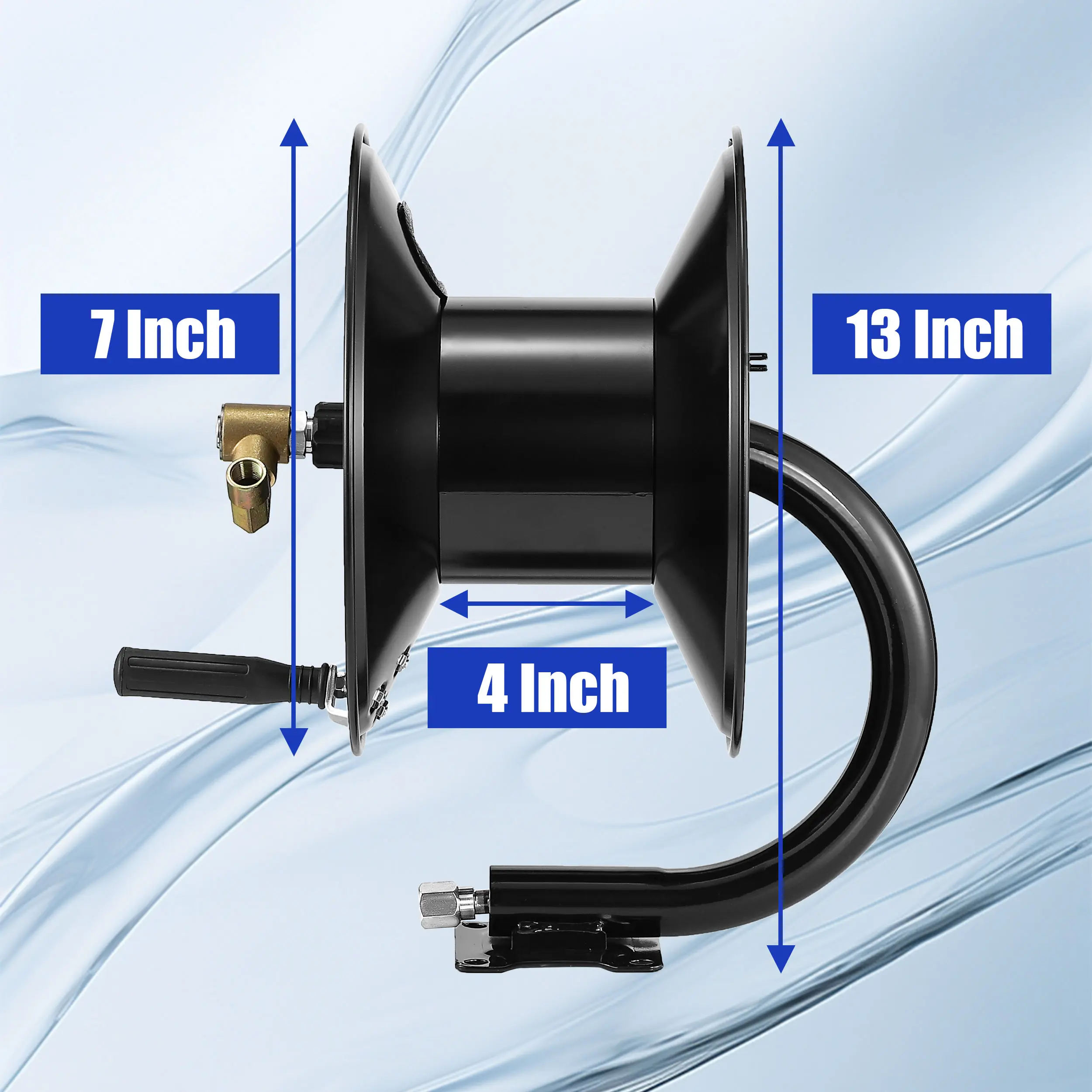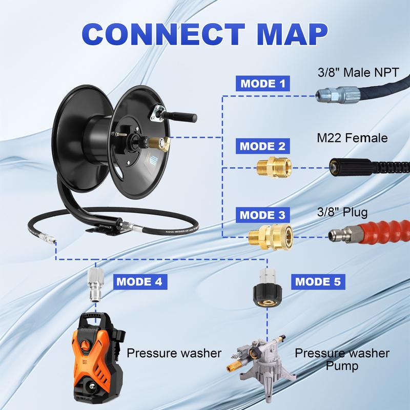 The reel connects via NPT 3/8" and is compatible with 3/8" NPT and M22 14mm via an adapter. The inlet pressure hose is 51". Install it on walls, floors, or outdoors. The hand crank design offers a comfortable grip, saving time and effort. Ensure secure installation before use.