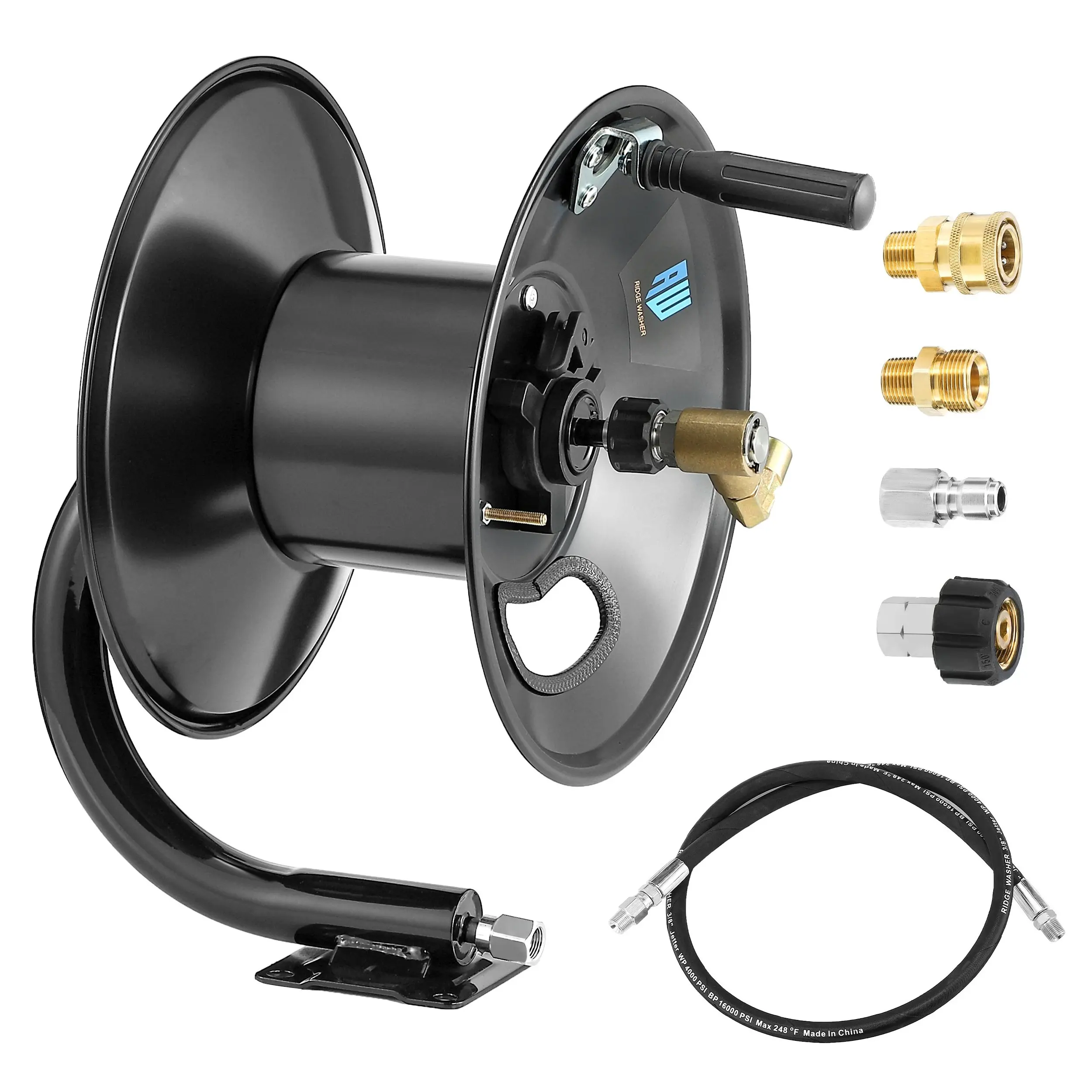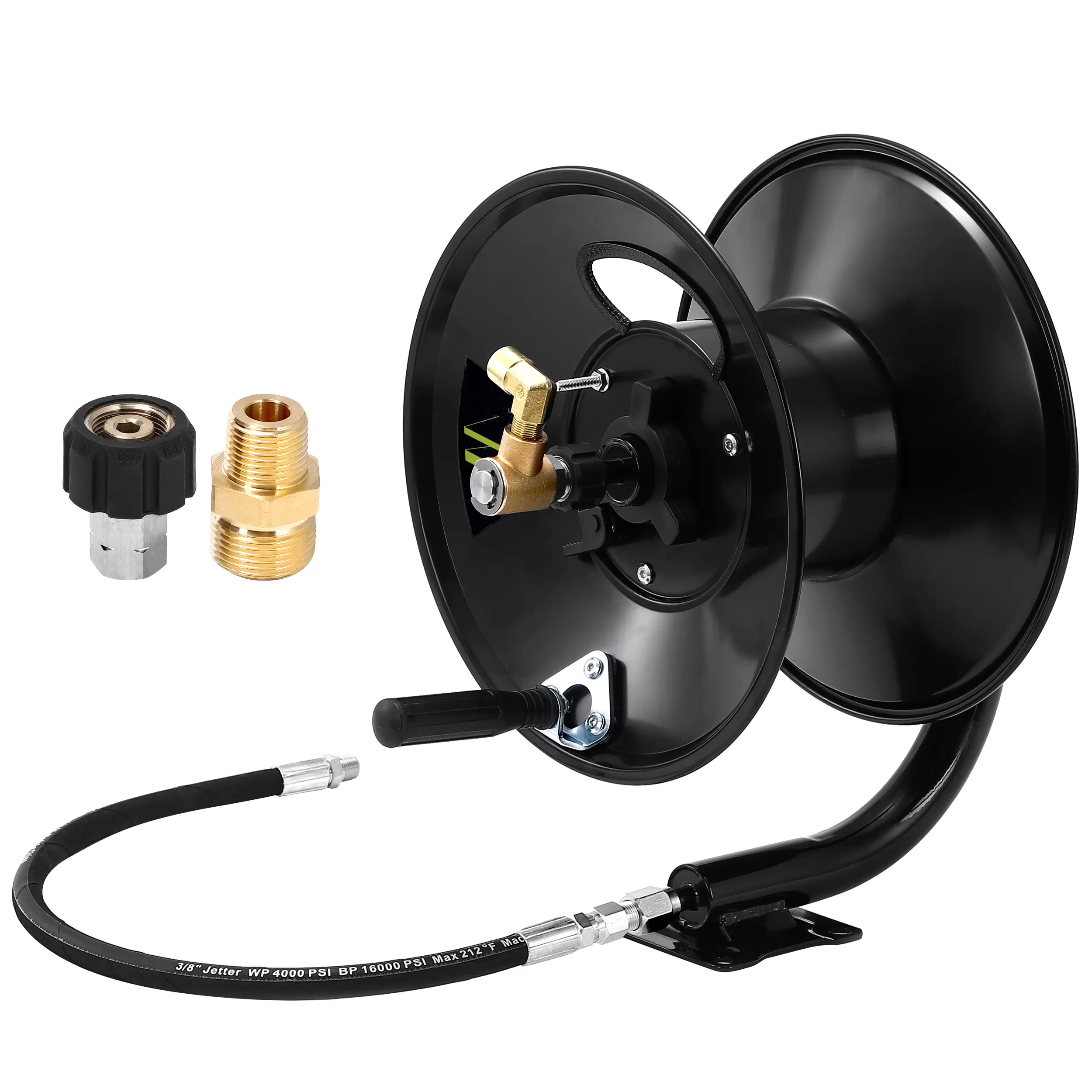 Crafted with a corrosion-resistant coating, this reel ensures rust prevention and maintains its quality over time. It boasts 90° solid brass outlet fittings, guaranteeing leak resistance and preventing hose tangling. The Max Working Pressure is 4000 PSI, with a Max Temperature of 176°F. It holds 100 feet of hose, though not included.