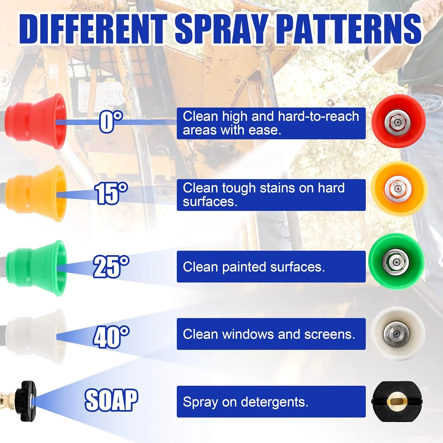 ·5 VERSATILE NOZZLES: This set includes five pressure washer nozzle tips with different spray patterns, allowing you to choose the perfect nozzle for any cleaning task. The nozzles included are 0°, 15°, 25°, 40°, and a soap nozzle for detergent application