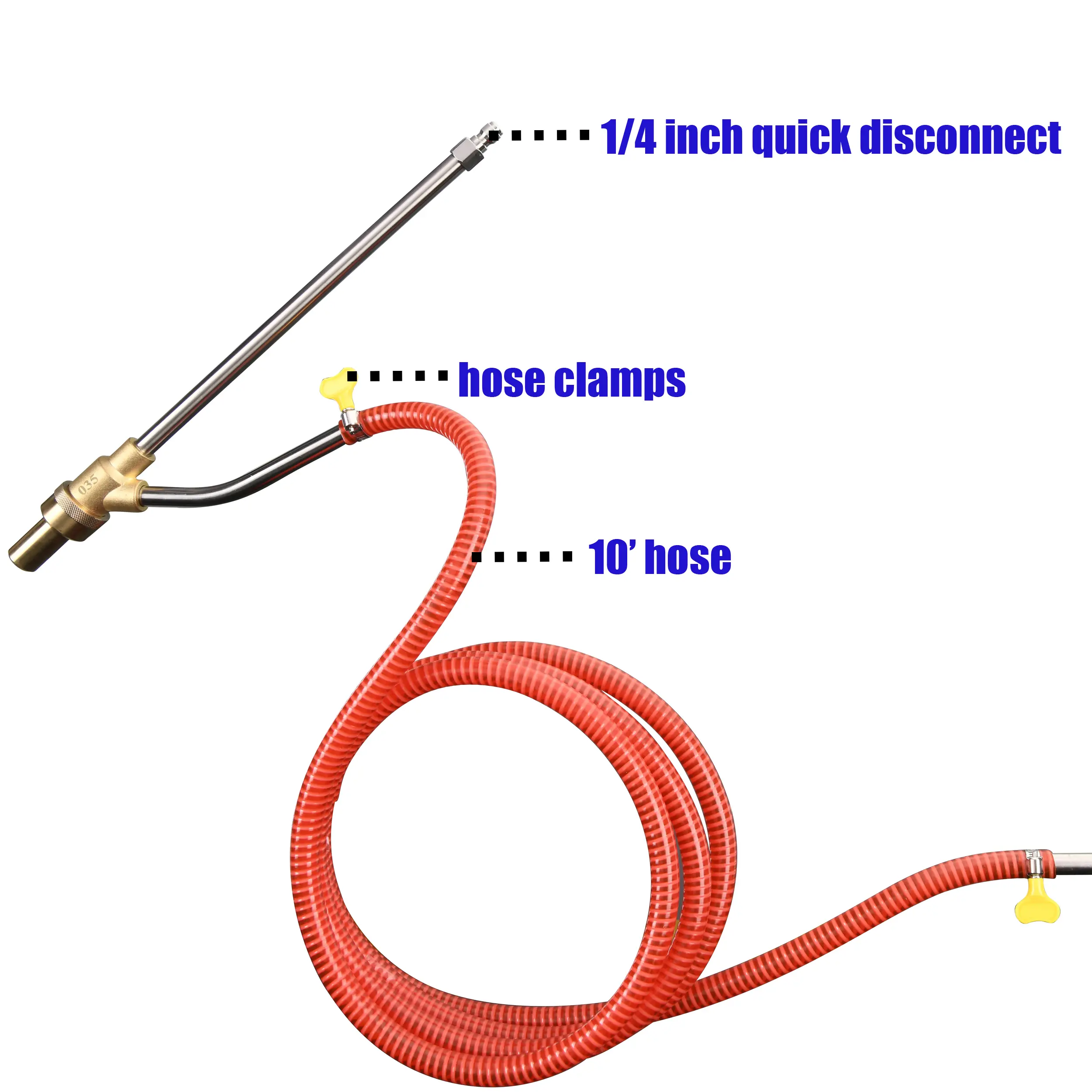 ·The pressure washer sandblasting attachments have a goggle, 10’ hose, 16’’ pressure washer wand (water input), 17’’ sand wand (sand input) and two hose clamps.