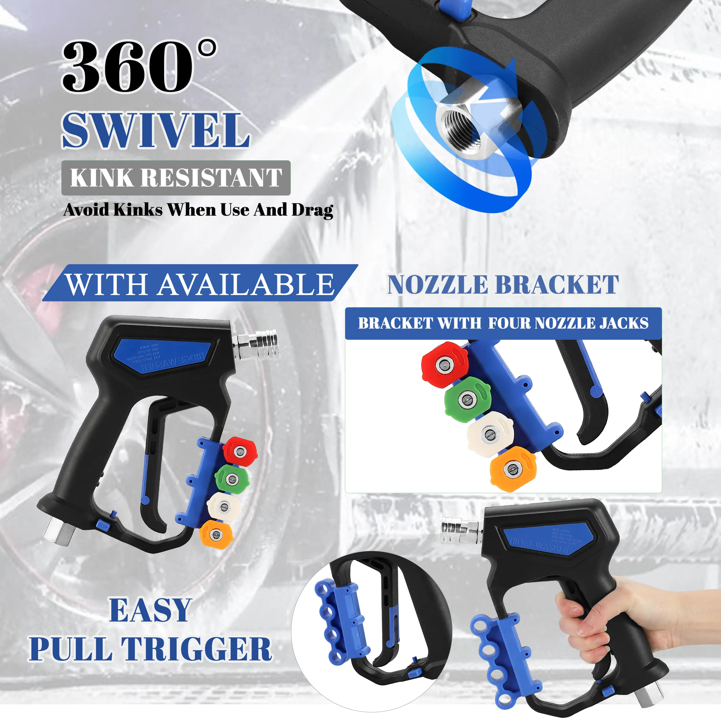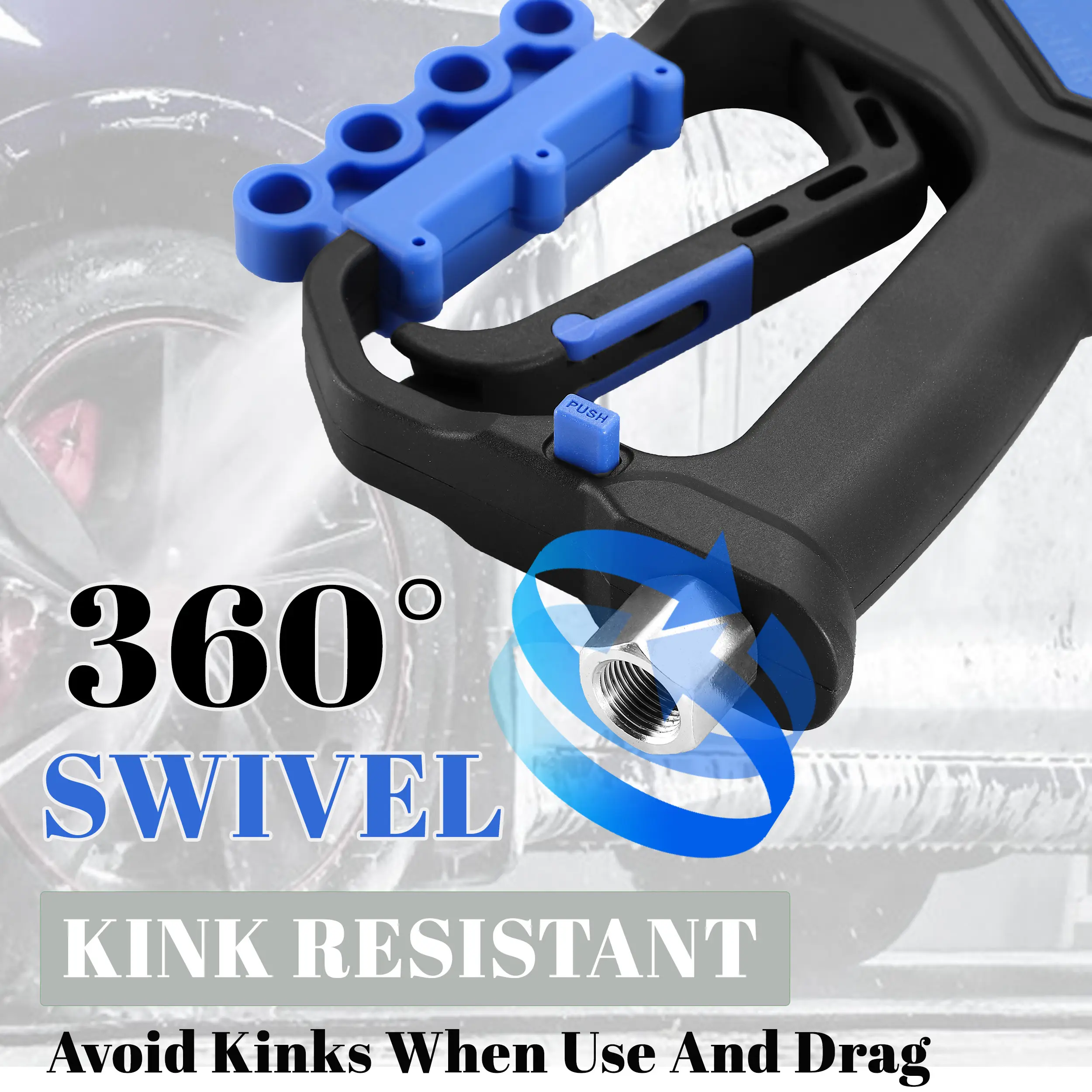 360° ROTATABLE TAIL: The pressure washer spray tool incorporates a unique 360° swivel design at the tail, preventing hose kinking during cleaning and prolonging the hose lifespan.