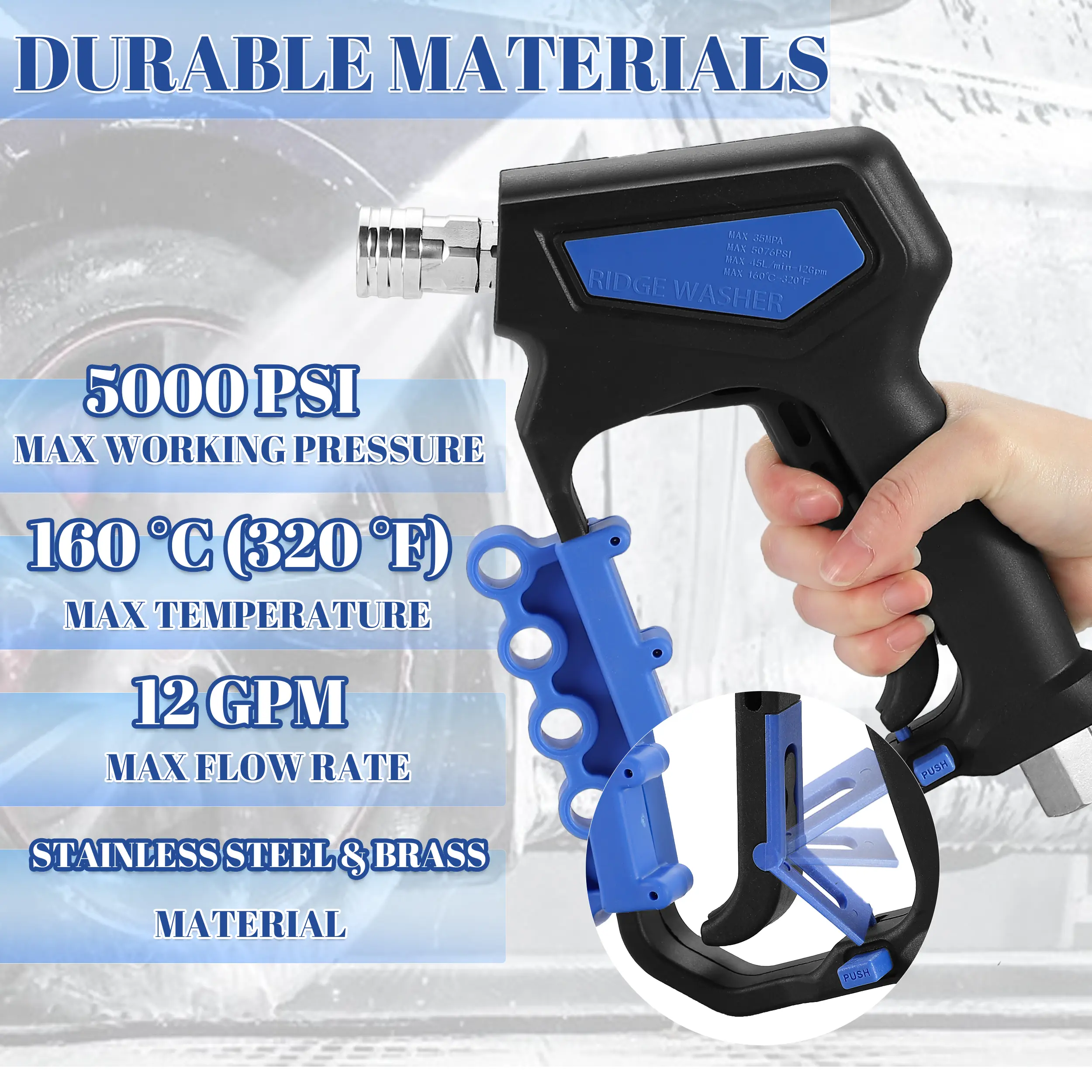 SECURE HANDLING: Equipped with a safety locking handle, the short pressure washer offers enhanced safety and convenience in use. It can withstand water temperatures of up to 160°C (320°F) and boasts a water flow rate of 12 GPM.