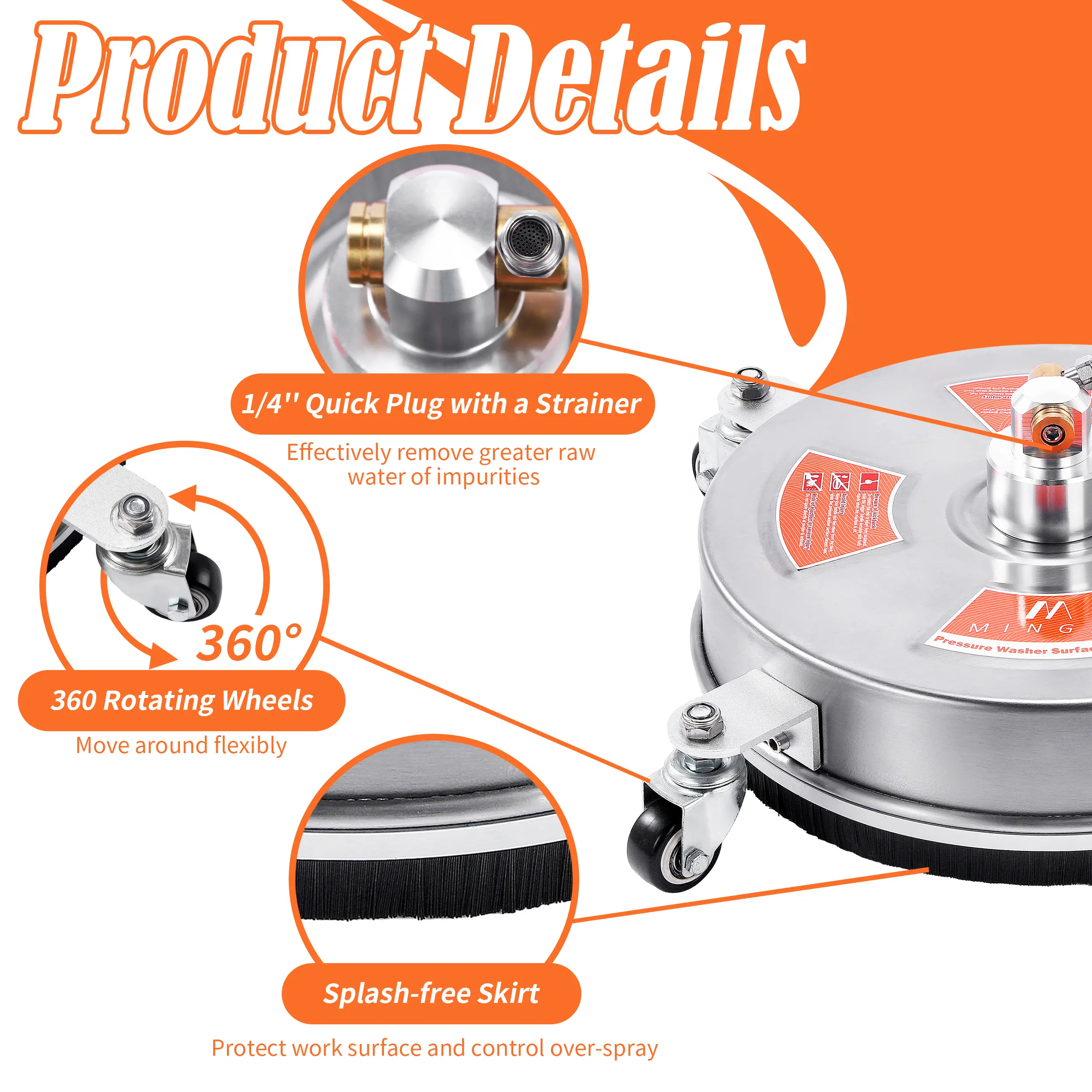 Equipped with four wheels and a splash-proof skirt, this cleaner ensures smooth maneuverability. It minimizes overspray, keeping you safe and dry. This enhances your overall experience during the cleaning process, making it user-friendly and efficient.