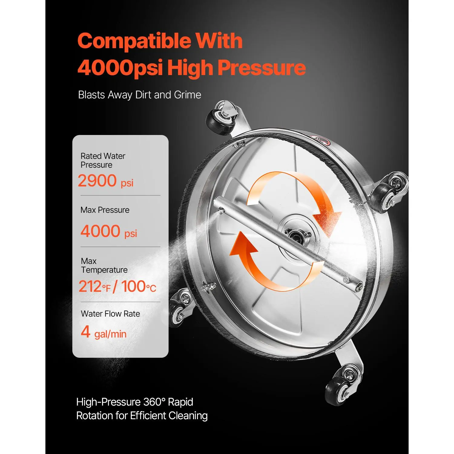 • 4000 PSI Powerful Pressure: With a rated pressure of 2900 PSI and a maximum pressure of 4000 PSI, the bottom 360° dual rotating nozzles quickly eliminate dirt and debris. No more struggling with tough stains.