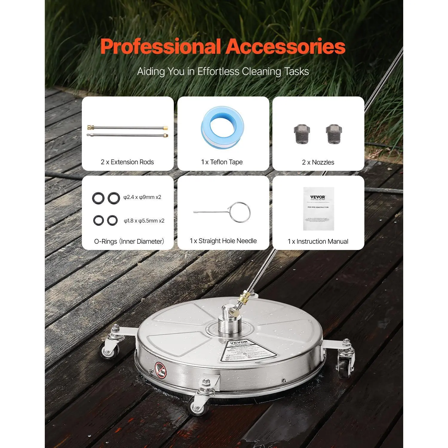 • Professional Accessories:This power washer surface cleaner comes with a variety of professional accessories, including hose connectors and an adapter kit for quicker assembly and immediate cleaning. Plus, a through-hole needle is included to easily solve any clogging issues.