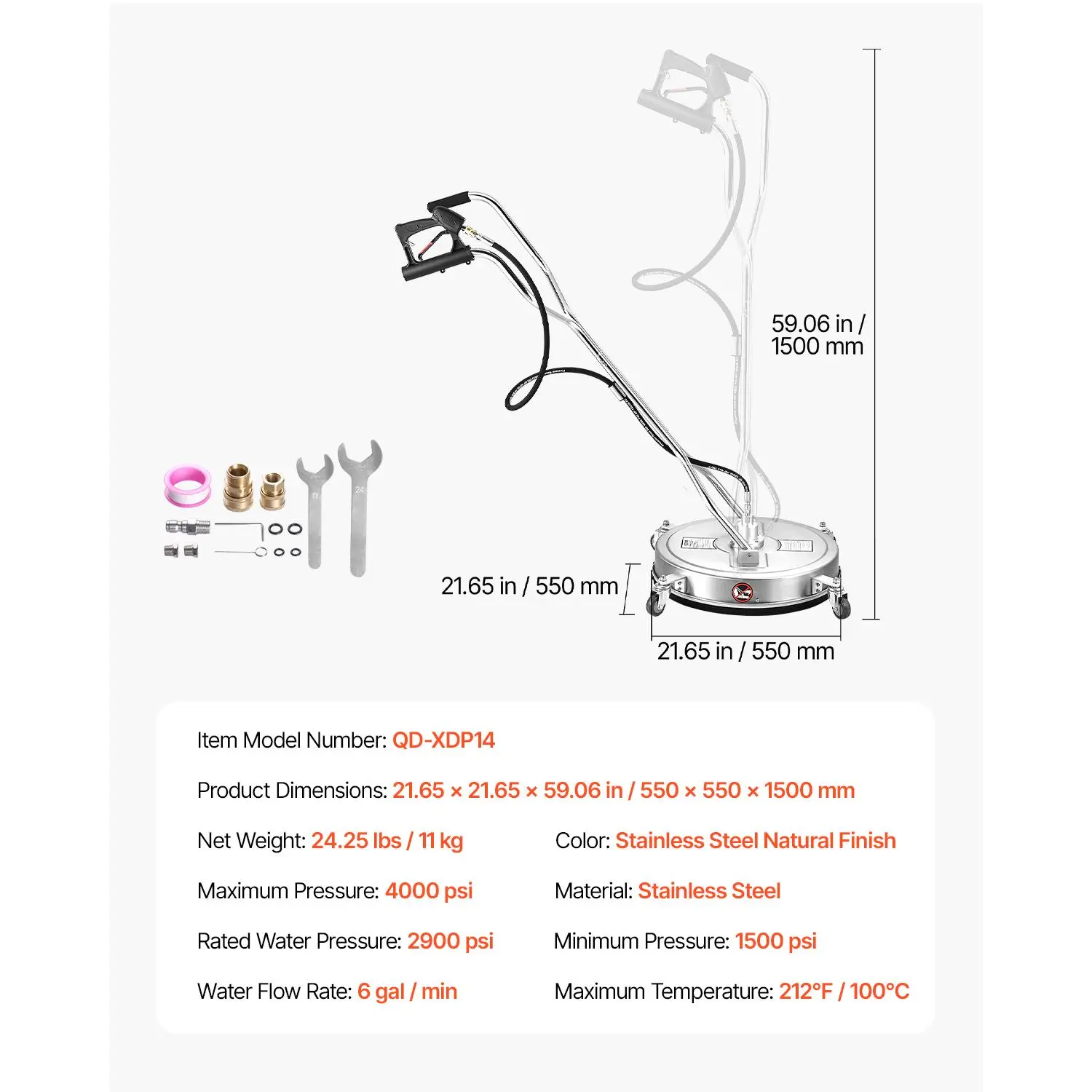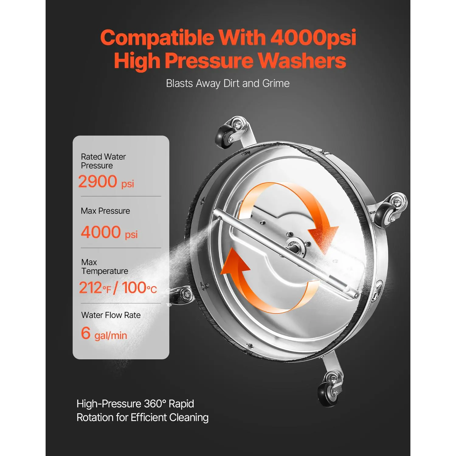 • φ22 Inch Quick & Efficient: Clean more, faster! With a powerful 6 gal/min flow rate, this φ22-inch pressure washer surface cleaner cleans every inch, making it ideal for both big jobs and everyday cleaning. Get the job done quickly and effortlessly – saving you time and energy!