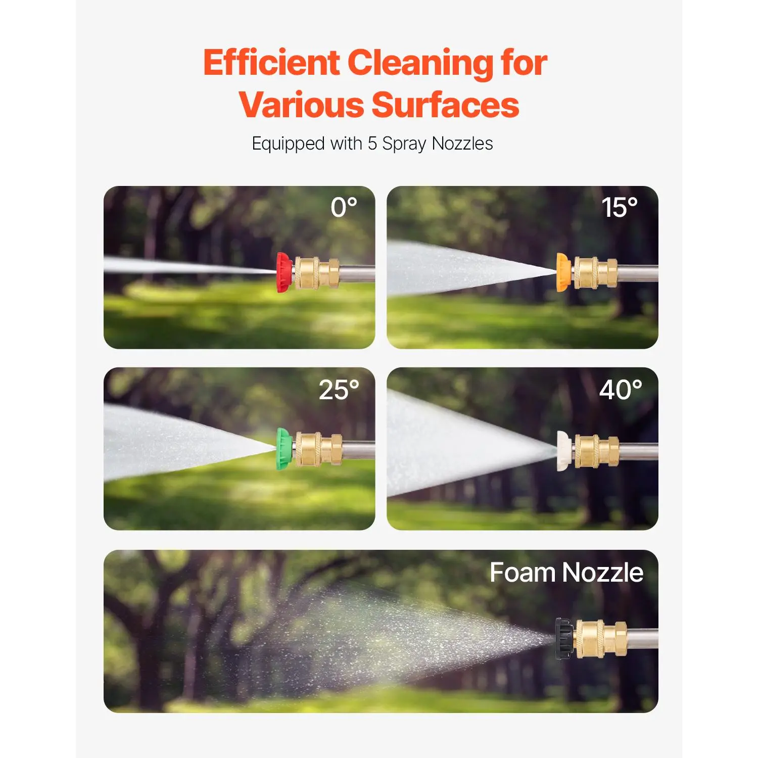 • Versatile Attachments: This telescoping pressure washer wand includes a comprehensive set of cleaning accessories: a brush head, 2 extension wands (15° and gutter cleaner), and 5 spray nozzles (0°, 15°, 25°, 40° and foam nozzle). These versatile attachments enable flexible operation at various heights and distances, ideal for cleaning high or hard-to-reach areas.