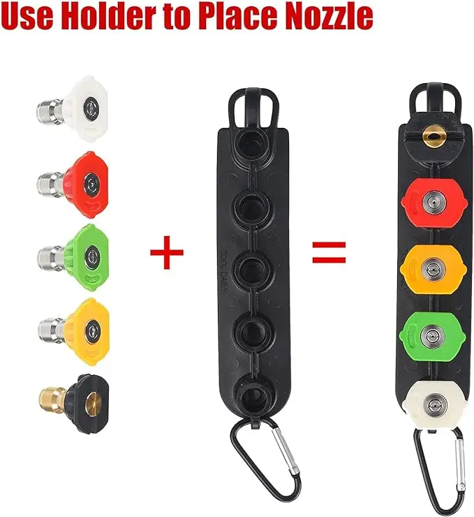 ·PACKAGE INCLUDE: 1 count Deluxe Pressure Washer Handheld Water Spray Tool, 1 count Replacement Wand Extension, 1 count Pressure Washer Nozzle Holder, 5 counts Pressure Washer Nozzles. Pressure washer nozzles have different angle (0, 15, 25, 40, 65 degree). Choose different nozzle according to your needs.