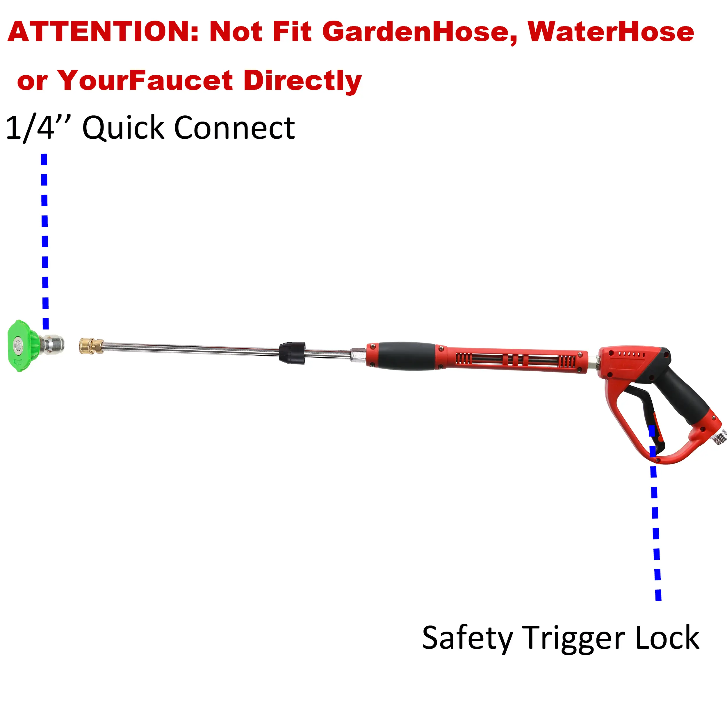 ·Pressure washer wand extension has 1/4’’ standard quick connector. Connects any accessories with 1/4’’ plug to the spray lance. Such as nozzles tips, pivoting coupler, foam cannon, extension wand, surface cleaner, undercarriage cleaner, water broom. Safety trigger lock to prevent unintended operation.
