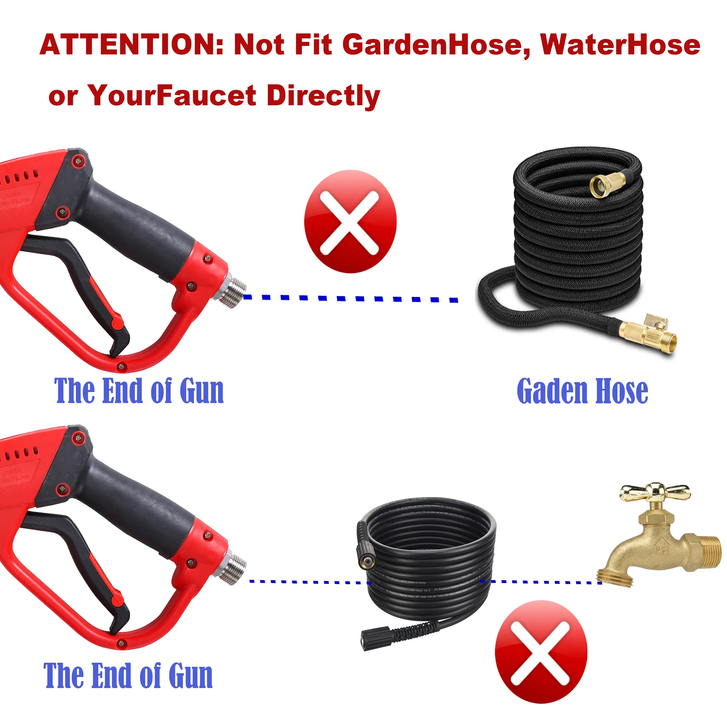 ·ATTENTION: Not Fit GardenHose, WaterHose or YourFaucet Directly". Max pressure is up to 5000 PSI. Max flow rate is 8 GPM. Max Temperature of water is rated to 60℃ / 140 F. Pressure washer Handheld Water Spray Tools have M22 fitting, compatible with M22 14mm and M22 15mm fitting. M22 14mm fitting is compatible with Generac, Simpson, Briggs Stratton, craftsman, karcher, Ryobi pressure washer. M22 15mm fitting is compatible with Sun Joe, Campbell, MI-T-M, AR Blue, Stanley, Cleanforce, Simoniz, Excell power washer.