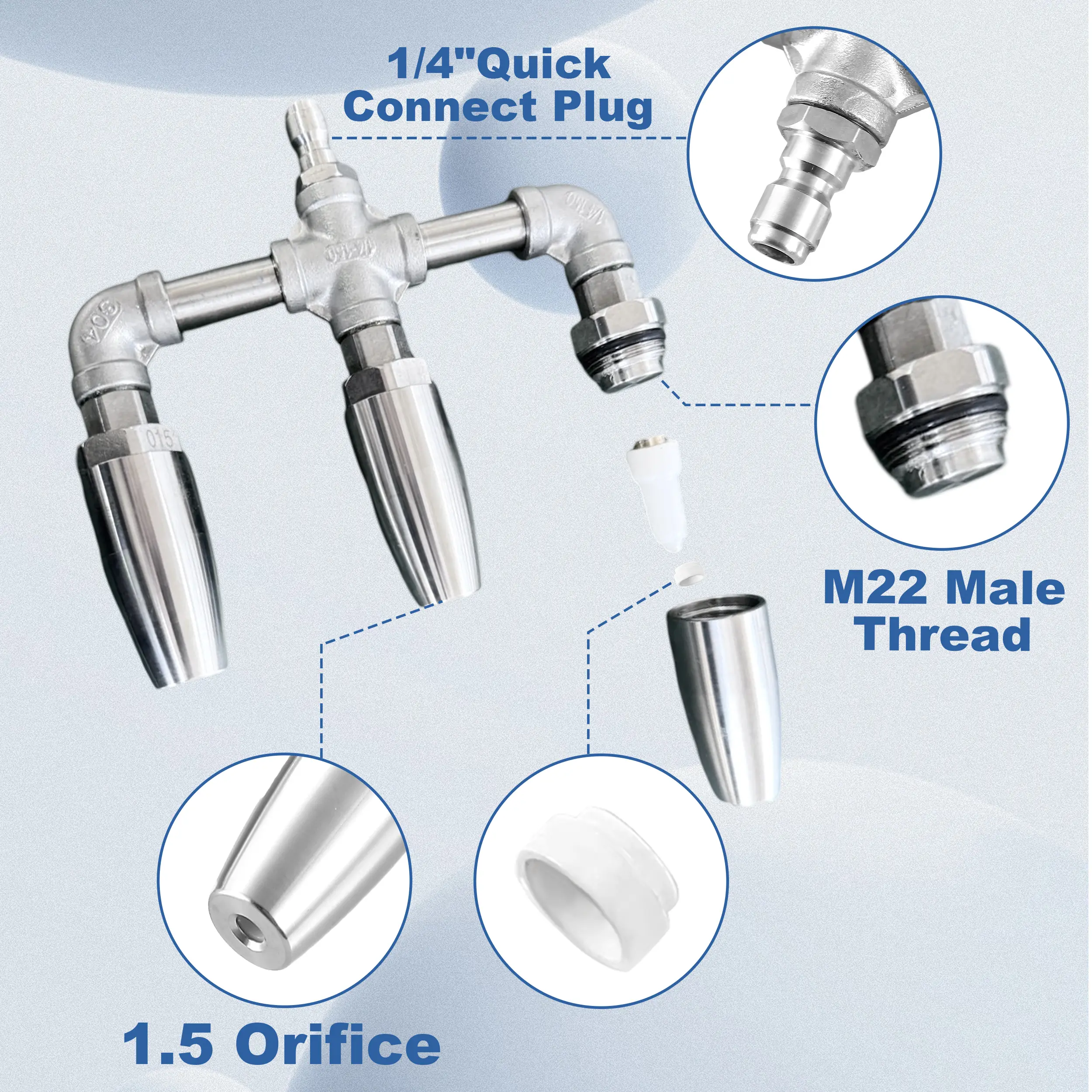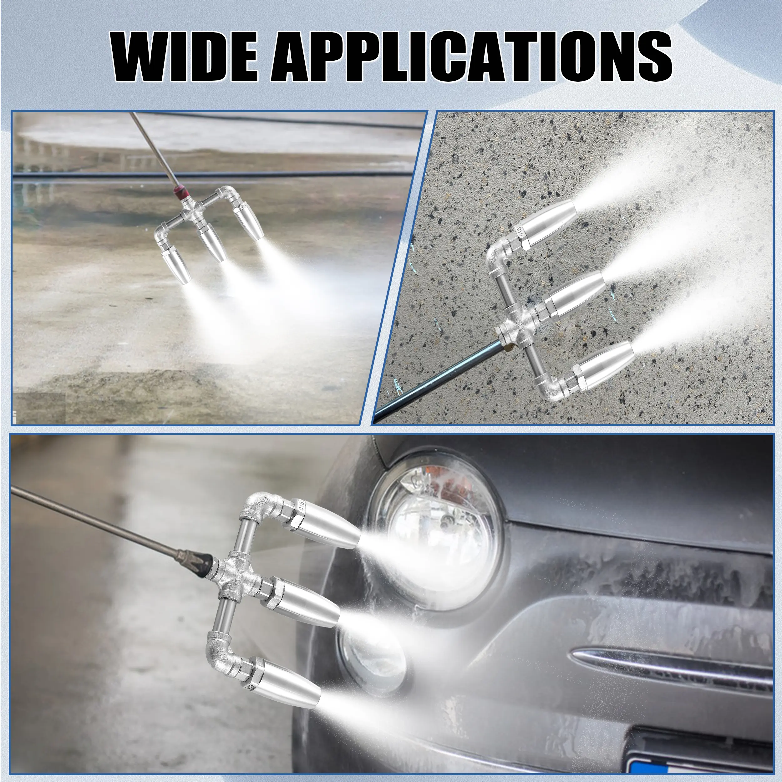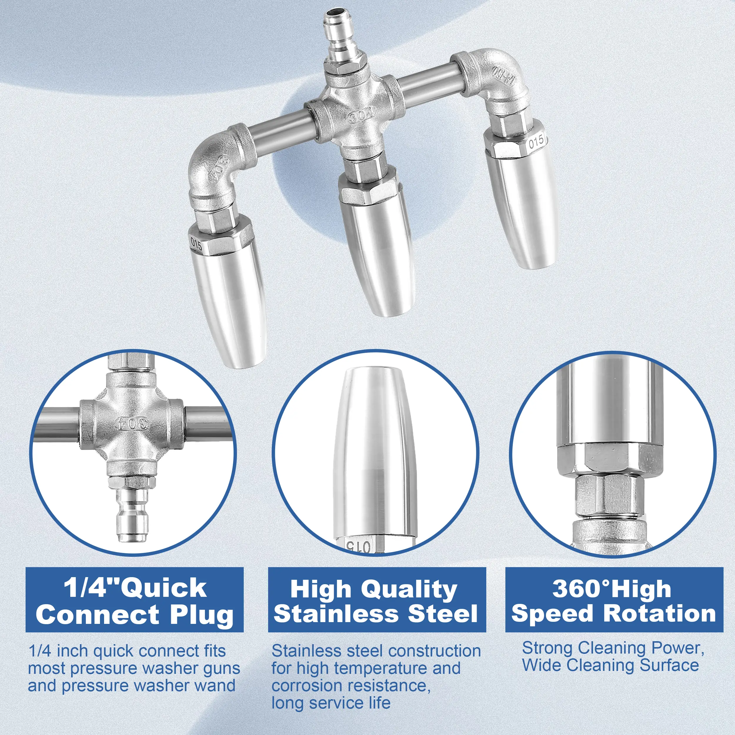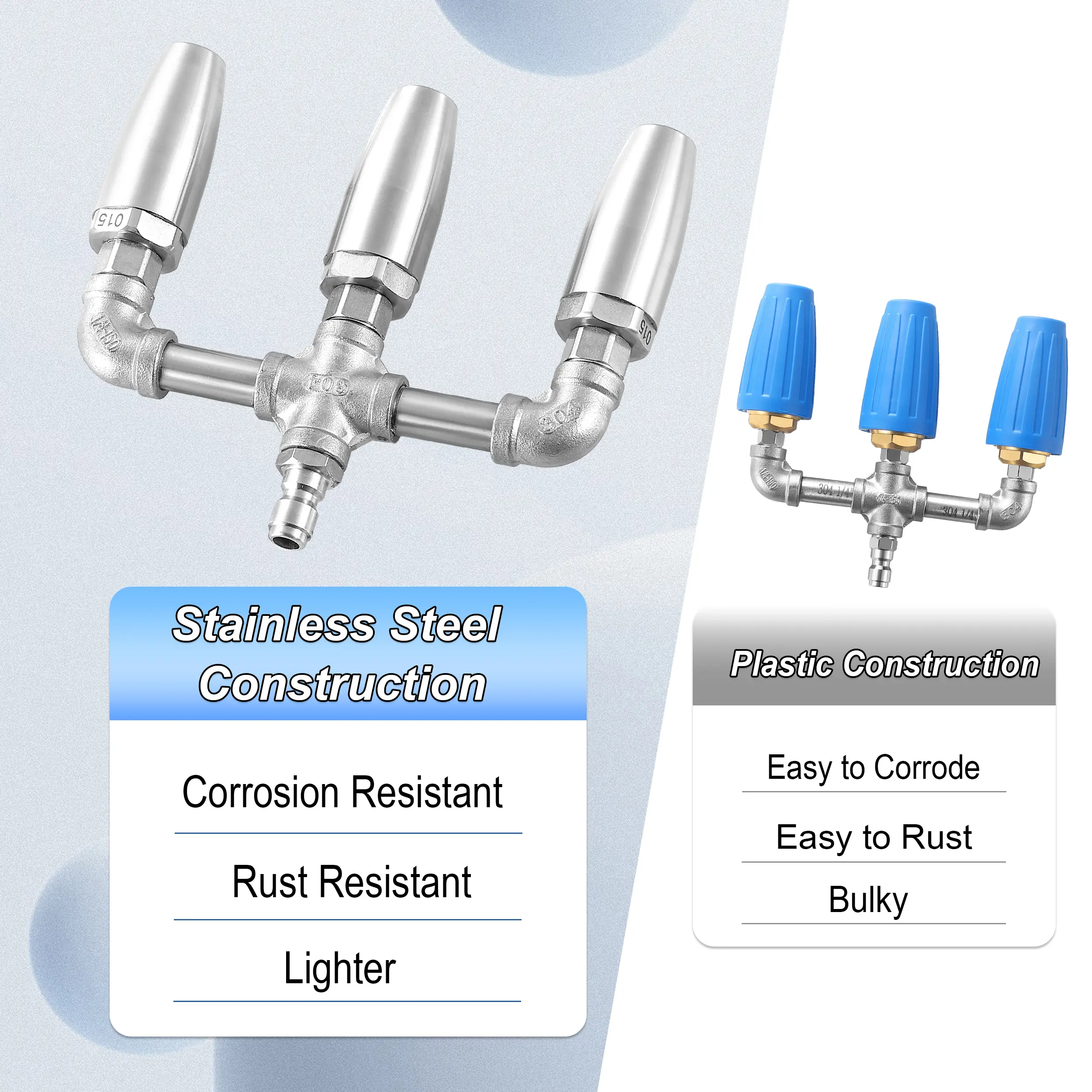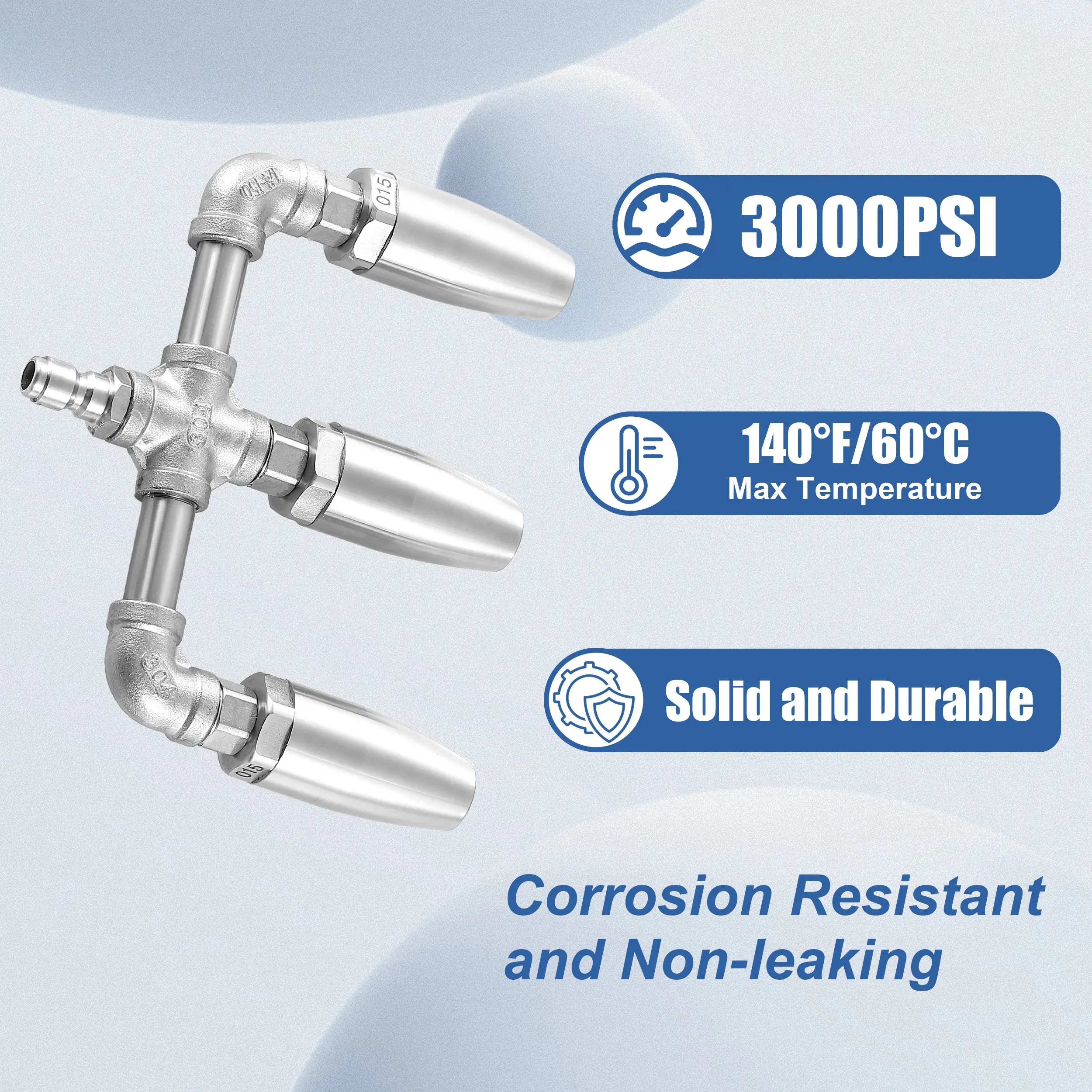 ·【Stainless Steel Construction】 Crafted from premium 304 stainless steel, the 3-in-1 turbo nozzle is robust, corrosion-resistant, heat-resistant, and leak-proof. With a maximum working pressure of 3000 PSI and a top working temperature of 140 ℉/60 ℃, it excels in various extreme cleaning tasks, prolonging the product's lifespan.