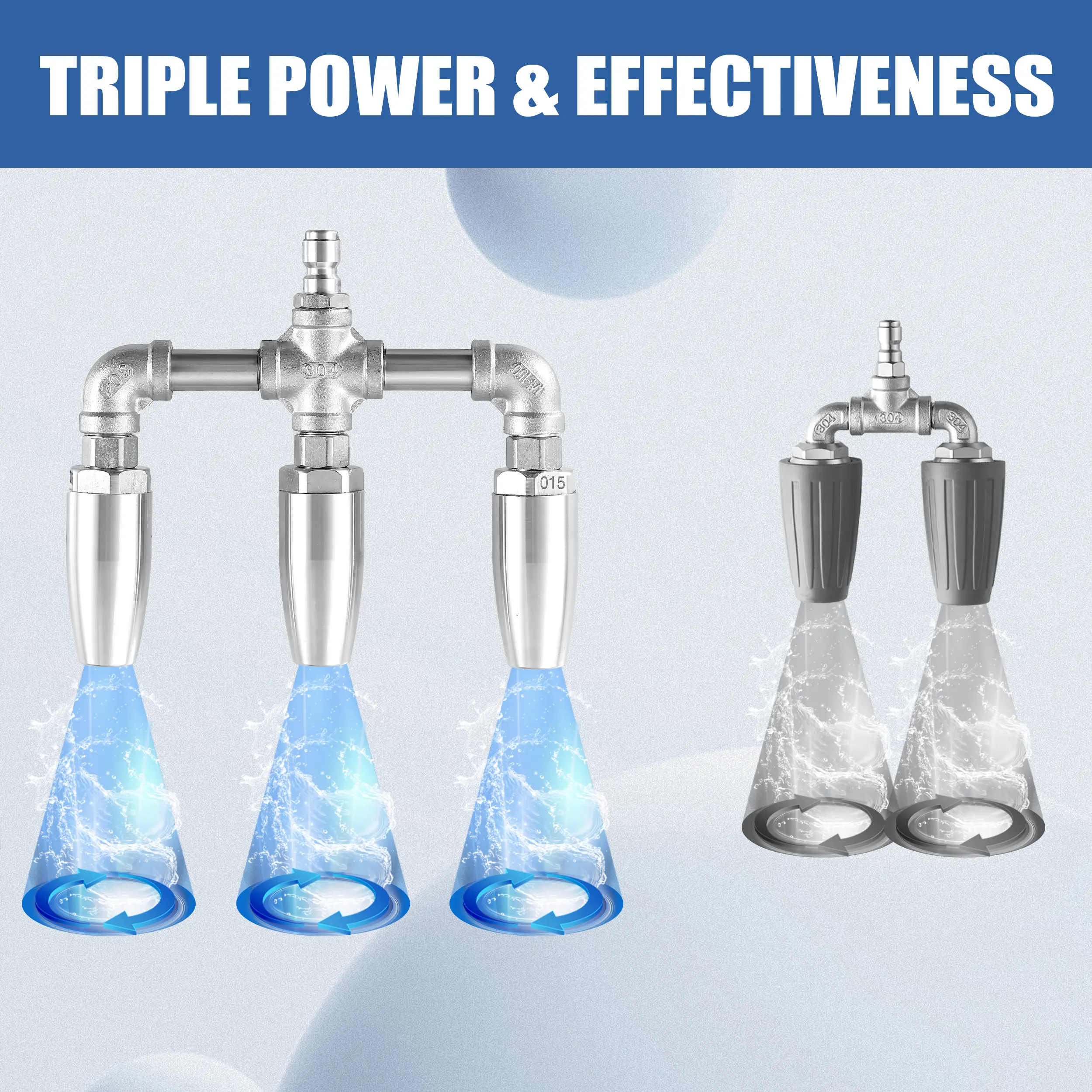 ·【Convenient Connection】The triple turbo nozzle for pressure washer features a 1/4" connector for quick detachment and connection, saving time and effort compared to threaded connections and preventing tangling. It can connect to most high-pressure cleaning spray lances and rods, facilitating diverse cleaning tasks.
